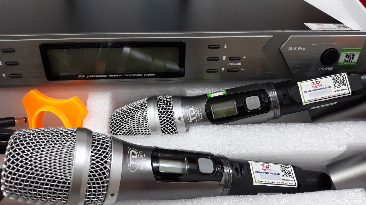 (HCM) Micro không dây TD Acoustic M8 Pro - Hàng Chính Hãng 2022 Âm thanh TD Acoustic chính hãng cam kết không bán hàng giả , nếu quý khách phát hiện hàng giả shop sẽ gửi lại tiền và tặng luôn sản phẩm quý khách đã mua. Xin cảm ơn quý khác hàng đã tin tưởng và ủng hộ Âm thanh TD Acoustic chính hãng ] Micro không dây TD M8 Pro là model đầu tiên được TD sản xuất và giới thiệu tới người tiêu dùng, tiếp nối M8-Pro là các model M10- Plus, M12 và M18 có các mức giá cao hơn. với ưu điểm lớn nhất M8-Pro có mức giá cực kì hợp lý nhưng chất lượng đem lại vượt trội hơn tất cả các sản phẩm trong tầm giá. Sản phẩm chính hãng, chế độ bảo hành tốt, M8-Pro đã bán cháy hàng ngay ngày đầu mở bán. với thiết kế phổ thông mặt nhôm phay xước màu ghi hiện đại, phù hợp cho mọi không gian và dễ dàng phối ghép với các bộ dàn âm thanh. M8-Pro sử dụng 2 râu thu phát sóng, là dòng mic chuyên dùng cho gia đình và các show