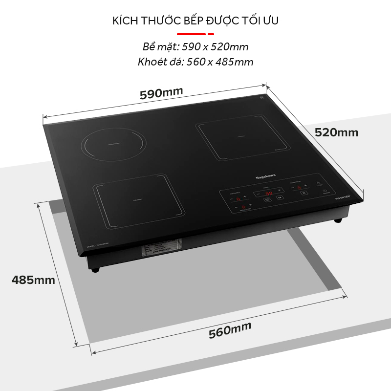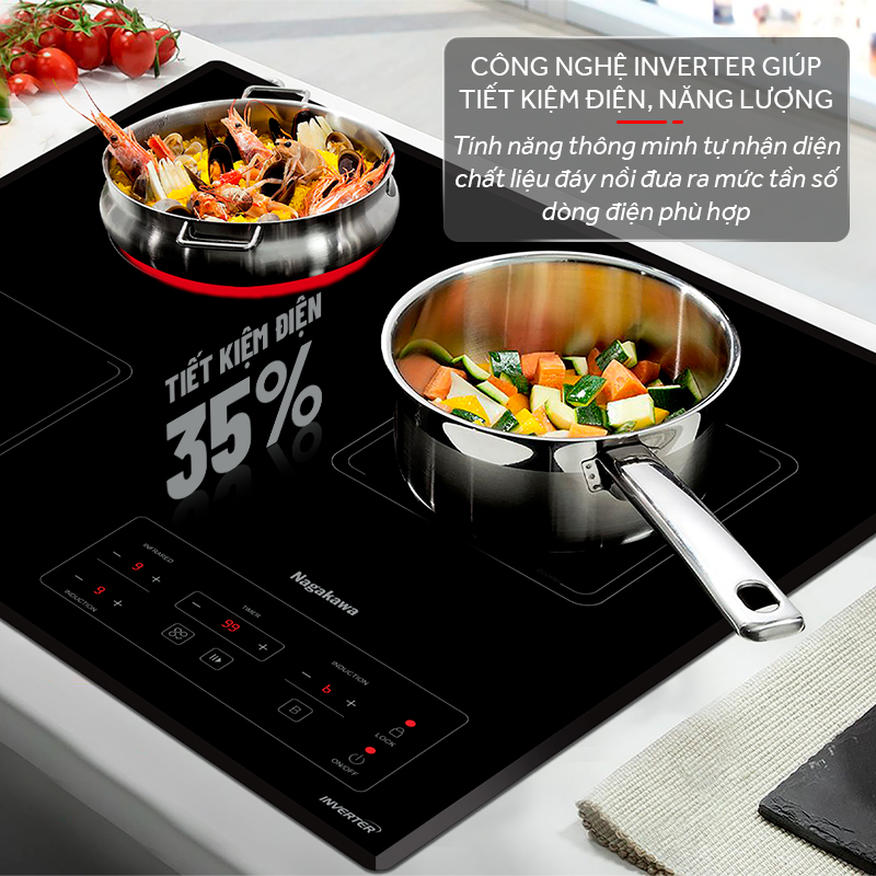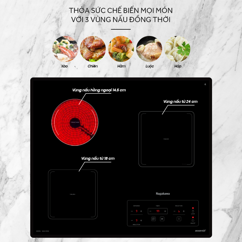 MIỄN PHÍ CÔNG LẮP ĐẶT CƠ BẢN + MIỄN PHÍ GIAO HÀNG TOÀN QUỐC Bếp từ hồng ngoại inverter Nagakawa NAG1253 Nếu bạn muốn sở hữu một chiếc bếp từ có tới 3 vùng nấu rộng lớn để bạn có thể thoải mái nấu cùng lúc 3 món ăn thì bếp từ hồng ngoại Inverter Nagakawa NAG1253M là lựa chọn lý tưởng cho bạn. Bếp 3 lò điện từ hồng ngoại Inverter Nagakawa NAG1253M được sản xuất và nhập khẩu từ Malaysia. Bếp có 2 vùng nấu từ và 1 vùng nấu hồng ngoại với các mức công suất khác nhau giúp người nội trợ thỏa sức chế biến thực phẩm từ chiên, xào, ràn, hầm, luộc hấp. Đặc biệt, bếp còn đem đến trải nghiệm nấu ăn thoái mái, đầy hứng khởi bằng nhiều tính năng an toàn thông minh. Thiết kế sang trọng tinh tế Bếp 3 lò điện từ hồng ngoại Inverter Nagakawa NAG1253M có thiết kế âm bàn hiện đại, tinh tế góp phần mang lại nét sang trọng và đẹp mắt cho không gian bếp nhà bạn. Cùng với mặt bếp được làm bằng kính cường lực Kanger mài vát 4 cạnh, chịu nhiệt chịu lực tốt, bóng loáng, dễ dàng vệ sinh, sử dụng cho các nồi đáy từ. Bếp được trang bị bảng điều khiển cảm ứng hiện đại, thông minh với các chức năng chỉnh công suất nấu, tắt / mở, khóa an toàn, hẹn giờ nấ giúp người dùng dễ dàng chọn lựa và điều chỉnh trong quá trình nấu, phù hợp với nhiều đối tượng sử dụng trong gia đình nhà bạn. Công nghệ Inverter tiết kiệm điện Bếp 3 lò điện từ hồng ngoại Nagakawa NAG1253M sử dụng công nghệ biến tần Inverter kiểm soát công suất của thiết bị, nhằm tránh hao phí năng lượng trong quá trình sử dụng. Nguyên tắc cơ bản của công nghệ Inverter là dựa trên kiểm soát từng tần số dao động (Hz) của các bảng mạch bên trong bếp, giúp đảm bảo độ ổn định của bếp, tiết kiệm tối đa năng lượng và gia tăng tính năng thông minh cho bếp. Với công nghệ Inverter, bếp 3 lò điện từ hồng ngoại Nagakawa NAG1253M có khả năng tự nhận diện chất liệu đáy nồi để đưa ra mức tần số dòng điện phù hợp, nhằm duy trì mức công suất tối ưu ổn định. Do được trang bị công nghệ Inverter tích hợp trong mạch công suất, bếp Nagakawa có thể tối ưu và kiểm soát lượng điện sử dụng để duy trì mức nhiệt mong muốn, giúp làm giảm lượng tiêu thụ điện, duy trì mức nhiệt độ ổn định theo mức công suất định sẵn. Nhờ vậy, bếp 3 lò điện từ hồng ngoại Nagakawa NAG1253M giúp tiết kiệm điện lên tới 35% mà vẫn đảm bảo độ bền của bếp. Hệ điều hành kép giúp bếp hoạt động bền bỉ, mạnh mẽ Hệ điều hành kép là ưu điểm vượt trội của bếp 3 lò điện từ hồng ngoại Nagakawa NAG1253M. Bếp Nagakawa thế hệ mới sử dụng 2 hoặc nhiều thanh công suất IGBT tạo thành cơ chế hoạt động thông minh: các IGBT có thể hoạt động đồng thời giúp cho bếp có thể đạt công suất tối đa 2400W trong vòng vài giây. Đồng thời, các IGBT có thể hoạt động luân phiên theo lệnh điều hành từ trung tâm, nhờ công nghệ biến tần giúp tiết kiệm năng lượng và đảm bảo tuổi thọ của bếp. Chức năng Booster nấu siêu nhanh Bếp 3 lò điện từ hồng ngoại Nagakawa NAG1253M với chức năng Booster giúp bạn lựa chọn mức công suất cao nhất khi muốn nấu các món đặc trưng cần gia nhiệt nhanh, giúp lưu giữ đúng hương vị món ăn mong muốn. Khi lựa chọn chức năng Booster, công suất bếp 3 lò điện từ hồng ngoại Nagakawa NAG1253M sẽ nhanh chóng được đẩy lên mức cực đại trong thời gian cực ngắn và hoạt động liên tục trong thời gian 5 phút, giúp rút ngắn tối đa thời gian đun nấu. Cụ thể, công suất bếp mặc định ở mức 1 là 400W, nếu chọn chức năng Booster, bếp nhanh chóng đạt công suất cực đại từ 2400W. Kích thước 3 vùng bếp: