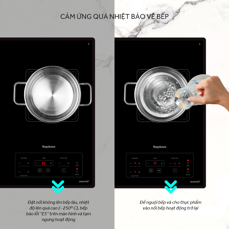 • Bếp nấu hồng ngoại bên phải phía trên kích thước 14,5 cm công suất 1200 W Công nghệ chống nhiệt lan tỏa Các chuyên gia bếp của Nagakawa đã nghiên cứu để đưa chức năng này vào bếp 3 lò điện từ hồng ngoại Nagakawa NAG1253M, giải quyết và ngăn chặn nhiệt độ nóng của bếp hồng ngoại tỏa ra, tránh làm ảnh hưởng đến hệ thống mạch điều khiển và tuổi thọ của bếp. Khóa an toàn Bếp 3 lò điện từ hồng ngoại Nagakawa NAG1253M được trang bị khóa an toàn, giúp bạn yên tâm nấu nướng khi nhà có trẻ nhỏ. Bạn cũng có thể lựa chọn sử dụng phím, tránh tình trạng kích hoạt các nút không cần thiết khi cần vệ sinh mặt bếp. Cảm ứng quá nhiệt bảo vệ bếp Chức năng chống quá nhiệt góp phần bảo vệ bếp 3 lò điện từ hồng ngoại Nagakawa NAG1253M, không cho phép sử dụng bếp khi nhiệt độ quá cao. Khi bạn đặt nồi không lên bếp lâu, nhiệt độ lên quá cao (~ 250 độ C), bếp sẽ báo lỗi, sau đó bếp sẽ tự ngừng hoạt động. Bạn có thể nhận diện lỗi với mã báo lỗi “E5” trên màn hình bếp. Lỗi sẽ biến mất khi bạn cho thực phẩm vào nồi hoặc nhiệt độ bếp xuống dưới mức cho phép. Chức năng Pause & Recall tiện dụng Khi bận việc đang lúc dở tay đun nấu, lúc này bạn có thể sử dụng phím Pause để tạm dừng hoạt động bếp. Khi trở lại, bạn chỉ cần ấn phím Pause một lần nữa, bếp 3 lò điện từ hồng ngoại Nagakawa NAG1253M sẽ tiếp tục hoạt động bình thường với chương trình đã cài đặt trước đó. Cảm ứng trào nước Cảm biến trào nước là một dạng cảm biến nhiệt của bếp 3 lò điện từ hồng ngoại Nagakawa NAG1253M, được đặt tại vị trí của bàn phím điều khiển. Trong quá trình nấu nướng, khi nước nóng trào ra bề mặt, bàn phím sẽ kích hoạt cảm biến tự tắt bếp, đảm bảo cho bếp luôn an toàn và sạch sẽ Hệ điều khiển trung tâm Với bếp 3 lò điện từ hồng ngoại Nagakawa NAG1253M, bạn có thể lựa chọn cách điều chỉnh tăng giảm công suất của tất cả các vùng nấu bằng cách sử dụng bảng điều khiển trung tâm. Mỗi vùng nấu có thể tự điều chỉnh độc lập đến 9 mức công suất