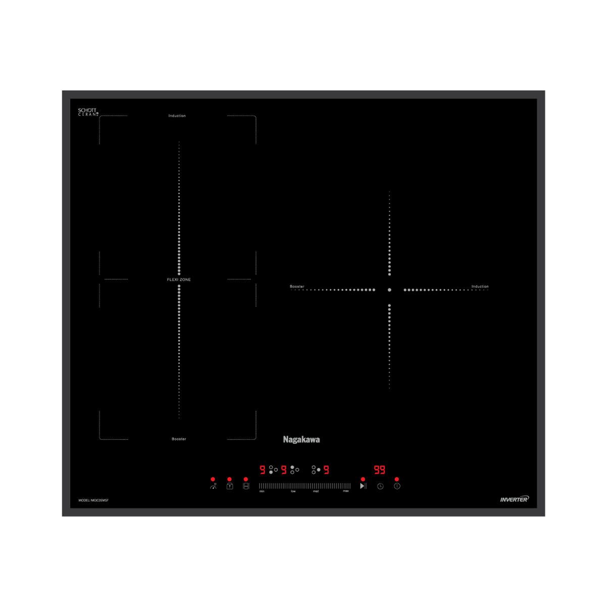 Nhờ công nghệ nấu đa điểm Flexi Zone, bếp điện từ thông minh Nagakawa NK3C05MSF kết hợp nhiều mâm từ hoạt động tạo hiệu năng mạnh mẽ, kiểm soát tốt các chức năng nấu nướng và tiết kiệm thời gian cho bạn.