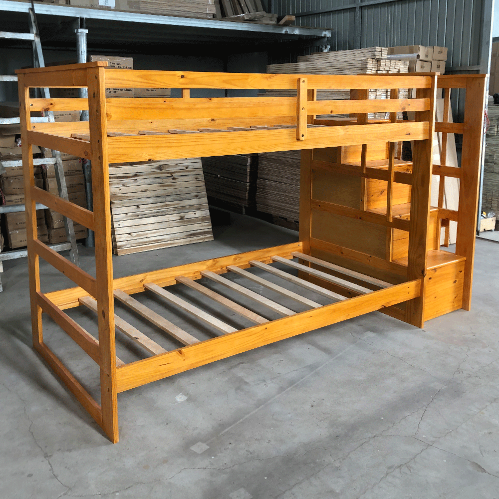 Giường tầng xuất khẩu Derry có kích thước lọt lòng giường trên/dưới là 100x193 cm, phủ bì 202x110x165 cm. Khoảng cách giữa 2 tầng là 95 cm, cầu thang bố trí bên phải. Chân trụ