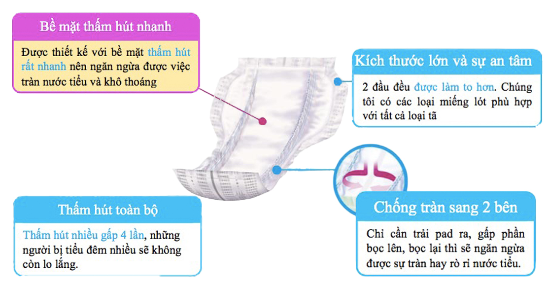 - An toàn: Phù hợp với mọi loại da: Bề mặt mềm mại, không gây kích ứng, an toàn cho da. Khả năng khử mùi hiệu quả: Ngăn ngừa vi khuẩn sinh sôi, giúp bạn luôn tự tin và thoải mái. Sản phẩm đạt tiêu chuẩn chất lượng: Đảm bảo an toàn cho sức khỏe người sử dụng. Thành phần: Polyethylene, Poly-urethane spandex, Hook and loop, Nonwoven fabrics, Tissue, Pulp, Sap, Hot melt glue. Thông số kỹ thuật
