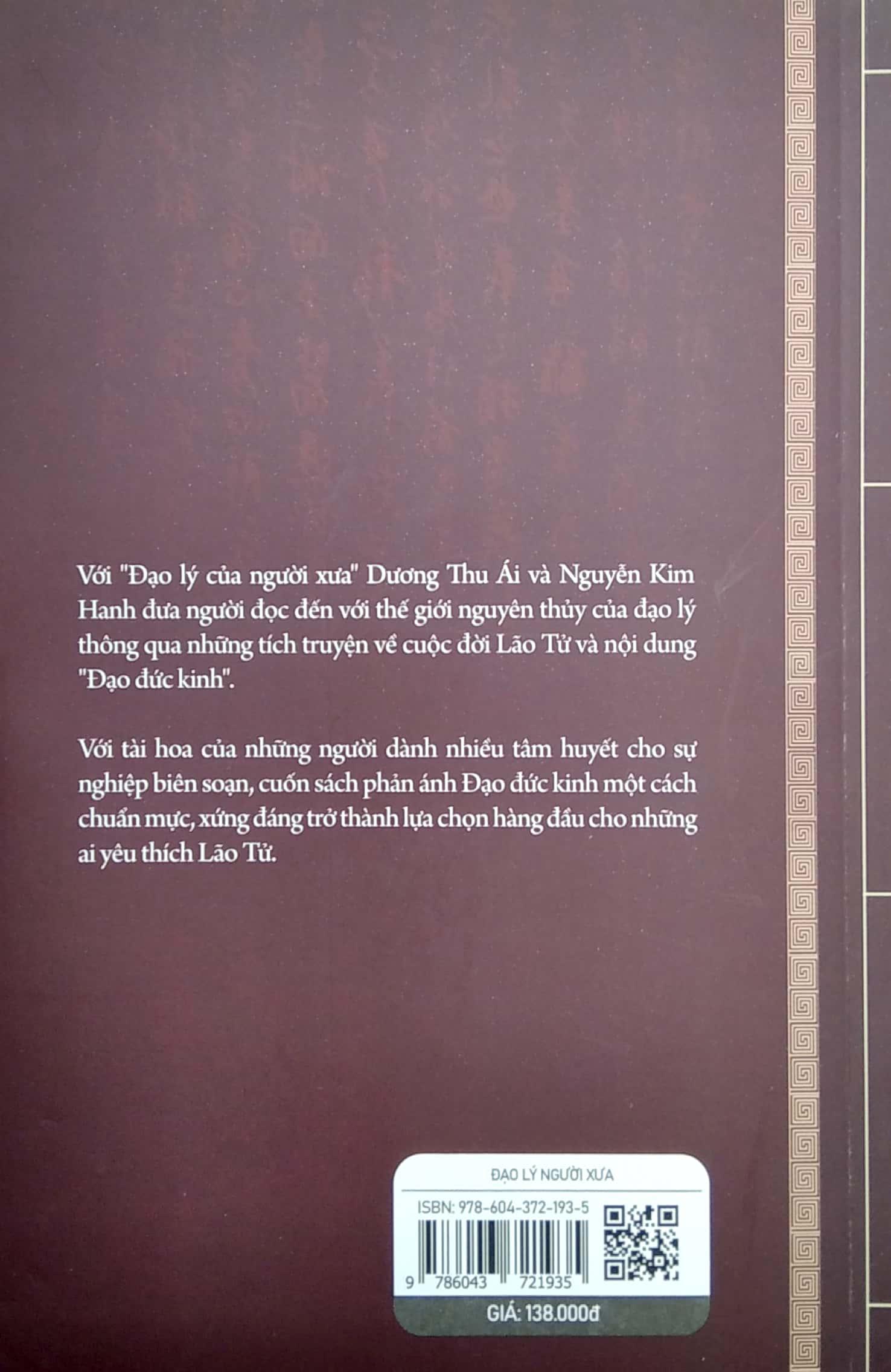 Minh Triết Phương Đông - Đạo Lý Người Xưa Với "Đạo lý của người xưa" Dương Thu Ái và Nguyễn Kim Hanh đưa người đọc đến với thế giới nguyên thủy của đạo lý thông qua những tích truyện về cuộc đời Lão Tử và nội dung "Đạo đức kinh". Với tài hoa của những người dành nhiều tâm huyết cho sự nghiệp biên soạn, cuốn sách phản ánh Đạo đức kinh một cách chuẩn mực, xứng đáng trở thành lựa chọn hàng đầu cho những ai yêu thích Lão Tử. Cuốn sách hàng đầu luận giải về Lão Tử và Đạo Đức Kinh. Trí tuệ con người nằm ở việc nhận biết quy luật cuộc sống. "Đạo lý" trong cuốn sách này chính là những quy luật cuộc sống lớn nhất, chi phối đời sống mạnh nhất. Là những giá trị vượt thời gian, được xem là di sản lớn lao của Lão Tử, một triết gia hàng đầu thời cổ đại.