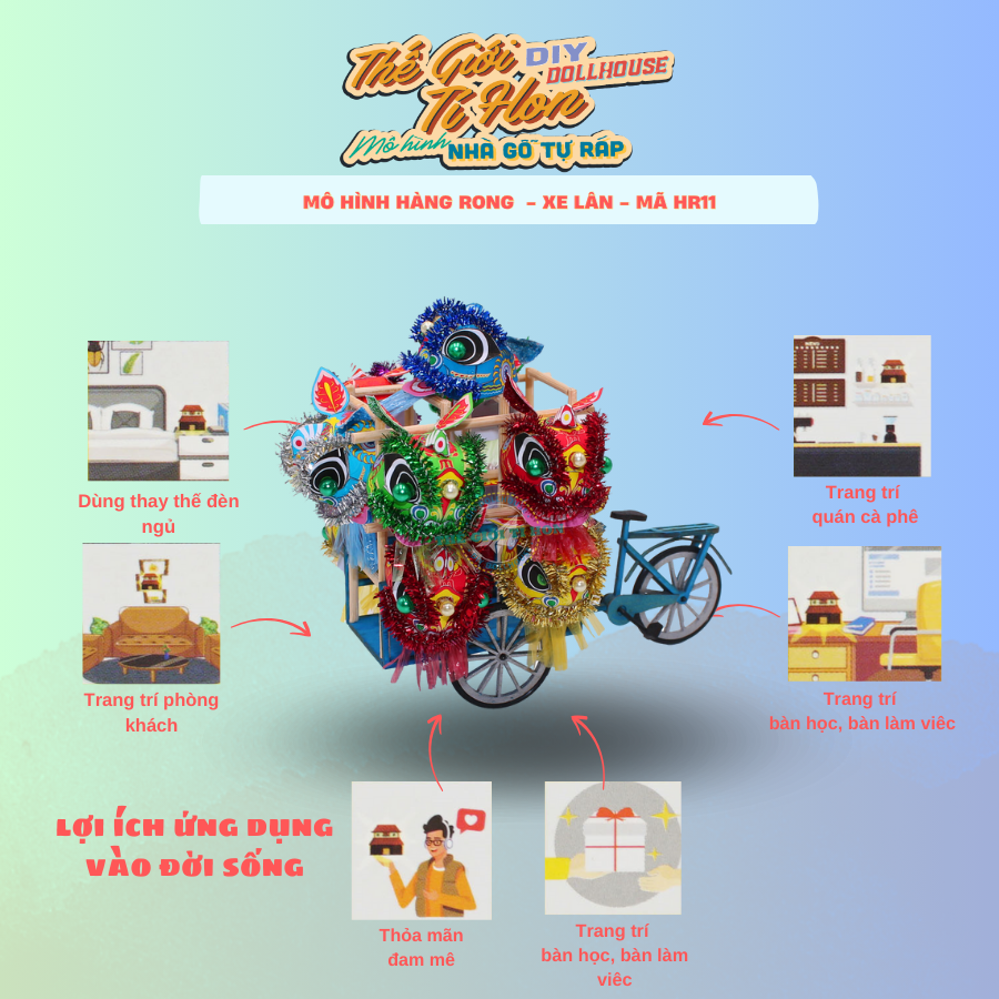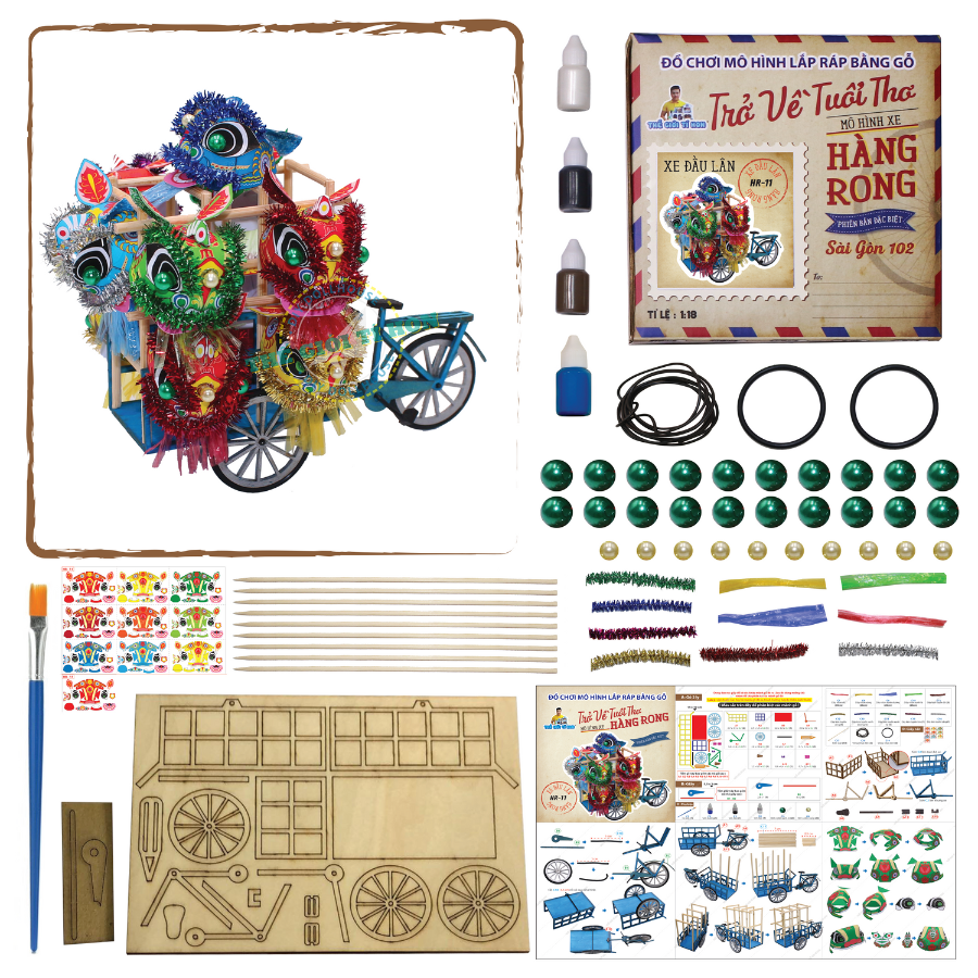 - SẢN PHẨM KHÔNG ÁP DỤNG ĐỔI TÊN BẢNG HIỆU GIÁ SẢN PHẨM CHƯA BAO GỒM THUẾ VAT, KHÁCH CẦN XUẤT VAT XIN VUI LÒNG LIÊN HỆ THẾ GIỚI TÍ HON QUA CHATBOX Mô Hình Xe Hàng Rong Sài Gòn Xưa Tí Hon - Xe Lân - HR11 ** ĐƠN HÀNG XE HÀNG RONG KHÔNG ÁP DỤNG FREESHIP Nghề làm lân khá phổ biến trong cộng đồng người Hoa ở Sài Gòn hồi đó. Để thả hồn vào những chiếc đầu lân, cần phải phụ thuộc vào sự tài hoa từ đôi tay của người thợ lành nghề. Khi cái nghề làm lân còn thịnh, không khó để bạn bắt gặp những chiếc xe lân đầy sắc màu rong ruổi khắp khu Chợ Lớn nhộn nhịp... Mô hình Xe Lân Sài Gòn Thu Nhỏ - HR11 Tìm Hiểu Mô Hình Tí Hon Thông số mô hình Đánh giá độ khó Kích thước sản phẩm 14.5 x 9.0 x 12.0 CM (Dài x Rộng x Cao) Xuất xứ VIỆT NAM Cân nặng 0.2 Kg Nguyên vật liệu Gỗ, hoa cỏ khô, vải, giấy, kim loại, đèn Led, gốm sứ,nhựa,... Sản phẩm bao gồm Hộp Pin có công tắt, nguyên vật liệu lắp ráp, sách hướng dẫn. Phụ kiện làm mô hình (Mua riêng): Keo chuyên dụng + Mica Che Bụi + Bộ dụng cụ Kit...() Shop hỗ trợ lắp ráp luôn nếu bạn có nhu cầu (có phụ phí)
