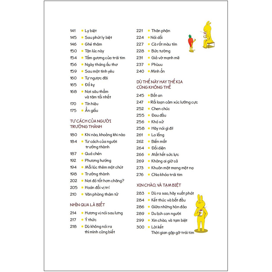 Seolto, một chú thỏ với đôi tai bên dài bên ngắn và người bạn Cà Rốt lâu năm là hai nhân vật chính của cuốn sách. Tác giả đã sử dụng hình ảnh cuộc sống của Seolto để nói lên những cảm xúc mà bất kỳ ai cũng đã, đang và sẽ trải qua trong suốt cuộc đời. Từ những cảm giác cô đơn, tâm trạng buồn bã khi mối quan hệ tan vỡ, cảm giác bị phản bội, bị “gai mọc trong tim” hay hơn thế nữa. Seolto có rất nhiều cung bậc cảm xúc khác nhau, nỗi đau của những ngày buồn, niềm vui của những ngày vui, sự phẫn nộ và ấm ức trong các ngày giận dữ và tâm trạng của những ngày mất hết sức lực.