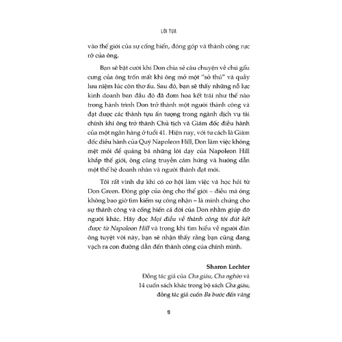 Mọi Điều Về Thành Công Tôi Đúc Kết Được Từ Napoleon Hill I. Giới Thiệu Sách Mô tả sản phẩm Mọi Điều Về Thành Công Tôi Đúc Kết Được Từ Napoleon Hill Năm 1937, Napoleon Hill đã thay đổi thế giới với cuốn Nghĩ giàu làm giàu – một trong những cuốn sách bán chạy nhất mọi thời đại, với hơn 20 triệu bản in và được dịch sang hơn 30 thứ tiếng. Triết lý của Hill về thành tựu cá nhân, sự giàu có và trao quyền đã tạo ra nhiều triệu phú trên khắp thế giới. Hiện tại, các nguyên tắc đằng sau Nghĩ giàu làm giàu trở nên quan trọng và phù hợp hơn bao giờ hết. Trong cuốn sách mới này - Mọi điều về thành công tôi đúc kết được từ Napoleon Hill - Don M. Green, Giám đốc điều hành của Quỹ Napoleon Hill, đã đưa những nguyên tắc thiết yếu của Hill đến ngay trong tầm tay bạn. Tác giả trình bày các bí mật và kĩ thuật đã được chứng minh sẽ giúp chúng ta đạt được thành công thực sự. Đồng thời, Don cũng trình bày chi tiết về ảnh hưởng của Napoleon Hill đối với thành công của chính ông - người lớn lên ở vùng nông thôn Virginia và trở thành Giám đốc điều hành của một ngân hàng khi mới 41 tuổi. Mọi điều về thành công tôi đúc kết được từ Napoleon Hill sẽ dạy bạn cách: