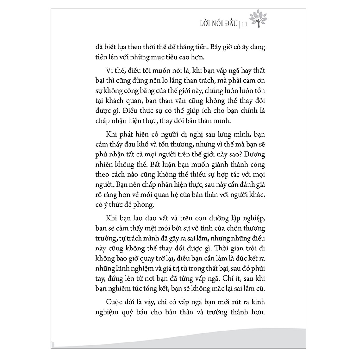 Mỗi Lần Vấp Ngã Là Một Lần Trưởng Thành Cuộc đời là quá trình không ngừng trưởng thành. Trong quá trình này, bạn sẽ khó tránh khỏi vấp ngã, sẽ trải qua nhiều lần đau thương, và sẽ có những lúc bạn cảm thấy vô cùng mỏi mệt, nhưng hãy tin rằng, chỉ có những người đã từng đau thương thì mới trở nên vững vàng hơn. Mỗi chúng ta từ nhỏ đến lớn, dù ít dù nhiều đều đã từng trải qua những lúc cảm thấy đau khổ, đây chính là trở ngại mà chúng ta thường nói tới. Tôi tin rằng sẽ không một người nào dám khẳng định cuộc đời của họ chẳng bao giờ gặp trở ngại. Đó chính là cuộc sống. Nhưng mong bạn suy nghĩ kĩ, mỗi khi bạn gặp phải khó khăn hoặc vấp ngã, ngoài việc cảm thấy đau khổ về mặt tinh thần, bạn còn học được điều gì? Tôi dám khẳng định rằng bạn đã có được kinh nghiệm, và khi đã lĩnh hội, bạn sẽ không vấp ngã lại nơi bạn đã từng ngã. Đây chính là sự trưởng thành. Đặc biệt, khi bạn rời xa vòng tay che chở, bao bọc của cha mẹ và nhà trường, bước chân vào xã hội, bạn sẽ gặp phải rất nhiều trở ngại và nhận ra xã hội này vốn không hề đơn giản như bạn tưởng tượng! Bạn cũng sẽ nhận ra khi bạn đau buồn hay gặp phải khó khăn, sẽ không có ai để ý đến sự tủi thân của bạn và cũng chẳng quan tâm đến sự bất lực của bạn. Thậm chí bạn cũng không muốn kể cho cha mẹ nghe vì sợ họ phải lo lắng cho mình, bạn chỉ có thể tự mình giải quyết, tự mình gánh chịu.