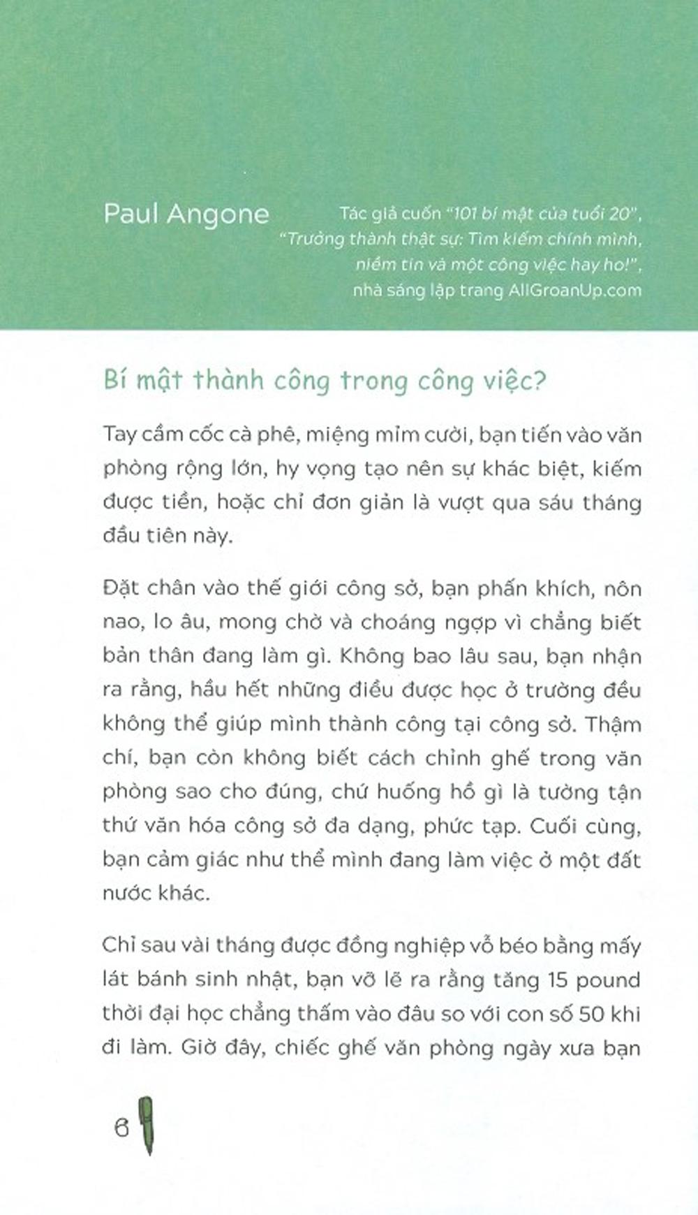 Đặt chân vào thế giới công sở, bạn phấn khích, nôn nao, lo âu, mong chờ và choáng ngợp vì chẳng biết bản thân đang làm gì. Không bao lâu sau, bạn nhận ra rằng hầu hết những điều được học ở trường đều không thể giúp mình thành công tại công sở. Thậm chí, bạn còn không biết cách chỉnh ghế trong văn phòng sao cho đúng, huống hồ gì là tường tận thứ văn hóa công sở đa dạng, phức tạp. Cuối cùng, bạn cảm giác như thể mình đang làm việc ở một đất nước khác.