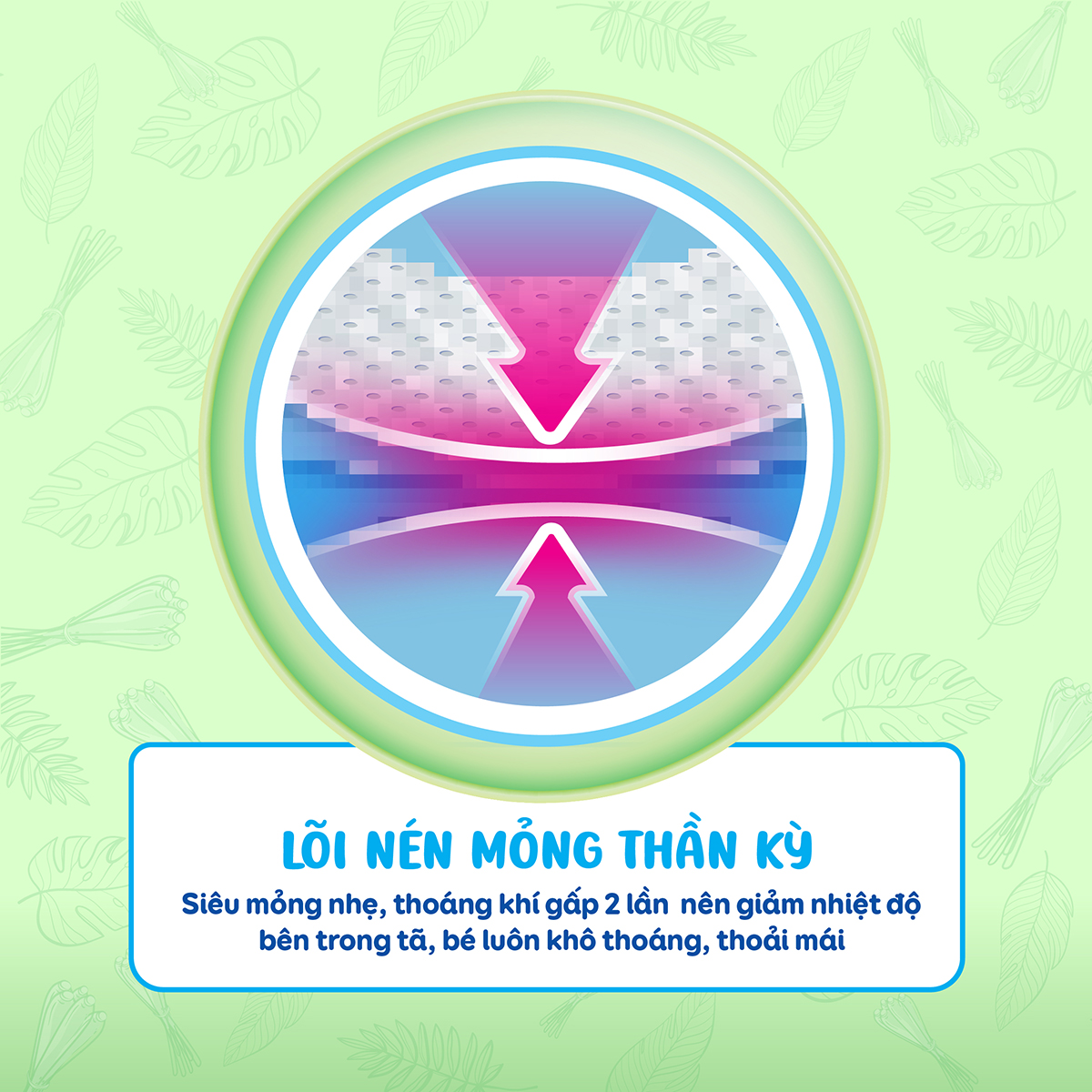 - Lõi nén thần kỳ siêu mỏng nhẹ, thoáng khí gấp 2 lần nên giảm nhiệt độ bên trong tã