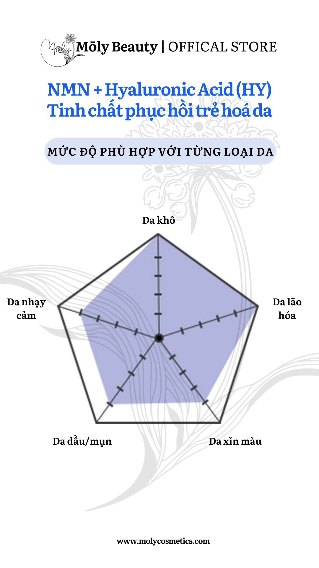 - Vì chỉ cần có NMN và 4 loại HY này là làn da của bạn không hề biết đến nếp nhăn. NMN được cho là chất sẽ kích hoạt gen Sirtuin ( một loại gen chống lão hóa) có trong da. Khi kết hợp NMN với 4 loại HY sẽ trở thành 1 loại siêu tinh chất để chống lại nếp nhăn và sự lão hóa của da. Với 1g của tinh chất này có thể chứa 6L nước, kết hợp với NMN đem lại làn da mọng nước và thúc đẩy trẻ hóa các tế bào dưới da. THÀNH PHẦN: