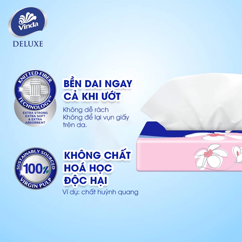 Khăn giấy rút Vinda được làm từ bột giấy nguyên chất, không chứa hóa chất tẩy trắng độc hại, an toàn cho sức khỏe người dùng. Sản phẩm Vinda bền dai ngay cả khi ướt, không để lại vụn giấy khi sử dụng
