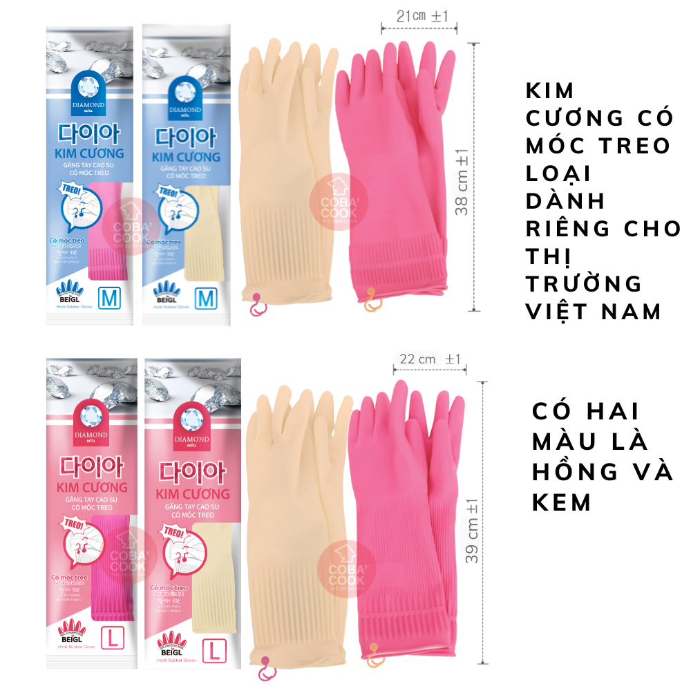 Găng Tay Cao Su Tự Nhiên Kim Cương có móc treo size L  Găng tay cao su rửa chén nhà bếp xuất Hàn Quốc siêu dai có móc treo - Thương hiệu: BEIGL- Hàn Quốc - Xuất sứ thương hiệu: Hàn Quốc - Sản xuất tại: Việt Nam - Hàng xuất khẩu chính hãng tại Việt Nam - Thông số sản phẩm + Size L: Dài 39 cm - Màu sắc: Kem, Hồng - Xuất xứ: Hàn Quốc   - Công dụng: Dùng để bảo vệ da tay khi cọ rửa nhà vệ sinh, rửa bát… - Hướng dẫn bảo quản: Để nơi khô ráo, thoáng mát, tránh để ở nhiệt độ cao - Chất liệu: Cao su tự nhiên Thông tin chi tiết sản phẩm găng tay cao su tự nhiên MJ Hàn Quốc -Chất liệu cao su tự nhiên, dai, mềm và có độ bền chắc cao: được làm từ chất liệu