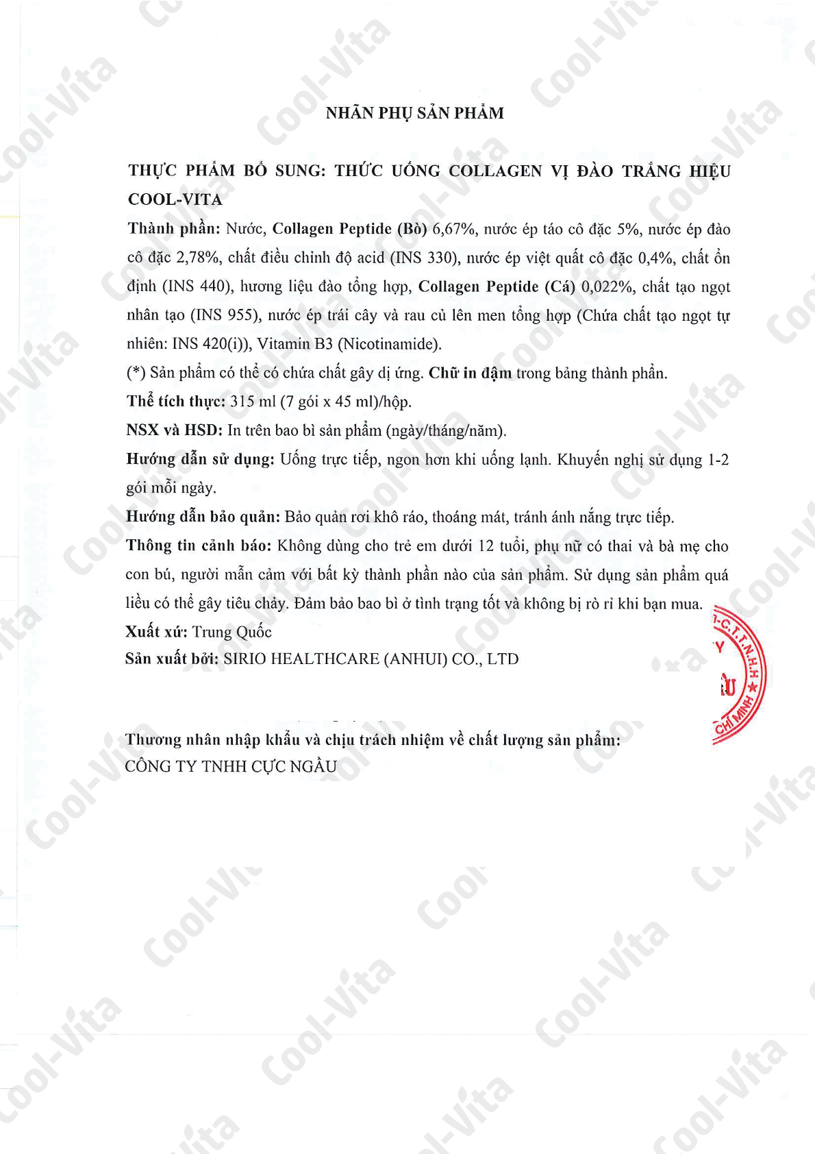 - Thành phần: Nước, Collagen Peptide (Bò) 6,67%, nước ép táo cô đặc 5%, nước ép đào cô đặc 2,78%, chất điều chỉnh độ acid (INS 330), nước ép việt quất cô đặc 0,4%, chất ổn định (INS 440), hương liệu đào tổng hợp, Collagen Peptide (Cá) 0,022%, chất tạo ngọt nhân tạo (INS 955), nước ép trái cây và rau củ lên men tổng hợp (Chứa chất tạo ngọt tự nhiên: INS 420(i)), Vitamin B3 (Nicotinamide).