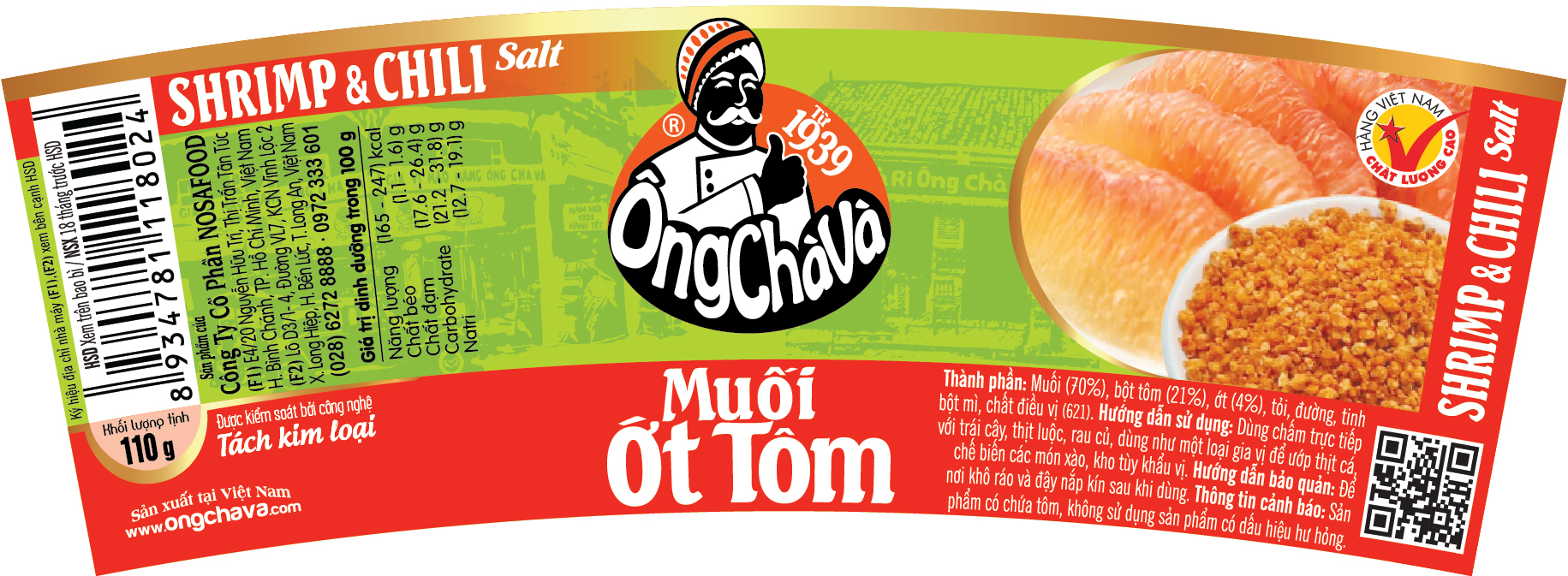 - Thành phần: Muối (70%), bột tôm (21%), ớt (4%), tỏi, đường, tinh bột mì,