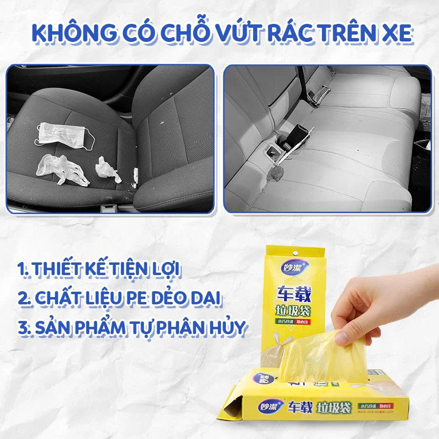 Túi Rác trên xe MyJae 1. Thiết kế tiện lợi, dễ dàng mang theo 2. Được làm bằng chất liệu PE dẻo dai, độ bền tốt 3. Sản phẩm tự phân hủy bảo vệ môi