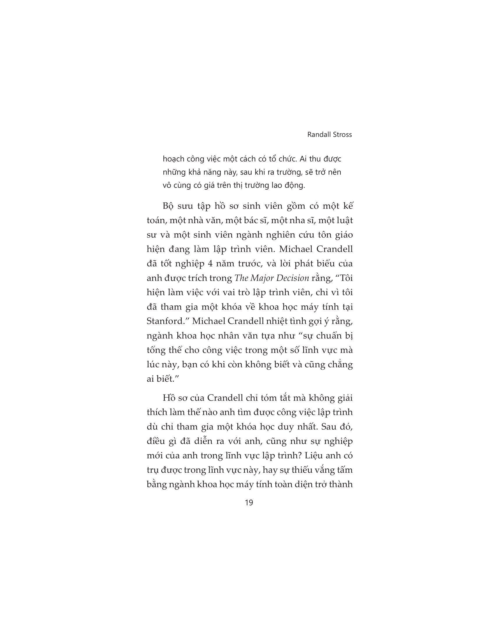 Bất kể ngành học mà bạn muốn hoặc đang theo đuổi là gì, nếu như bạn cảm thấy hoang mang về cuộc sống hậu đại học và muốn trang bị cho bản thân những kỹ năng nghề nghiệp tốt nhất ngay từ bây giờ, hãy bắt đầu bằng cách đọc Nắm bắt xu thế - Chọn nghề phù hợp. Những câu chuyện thực tiễn trong cuốn sách này sẽ cung cấp những lời khuyên và giúp bạn tự rút ra những điều cần làm, ví dụ như tham gia các kỳ thực tập ngay từ năm hai hay xây dựng mạng lưới quan hệ với các cựu sinh viên. Bạn sẽ vừa có thể theo đuổi đam mê tri thức, vừa tích lũy được những kỹ năng mềm và kỹ năng chuyên môn thiết thực để sẵn sàng đối mặt với tương lai bất định.