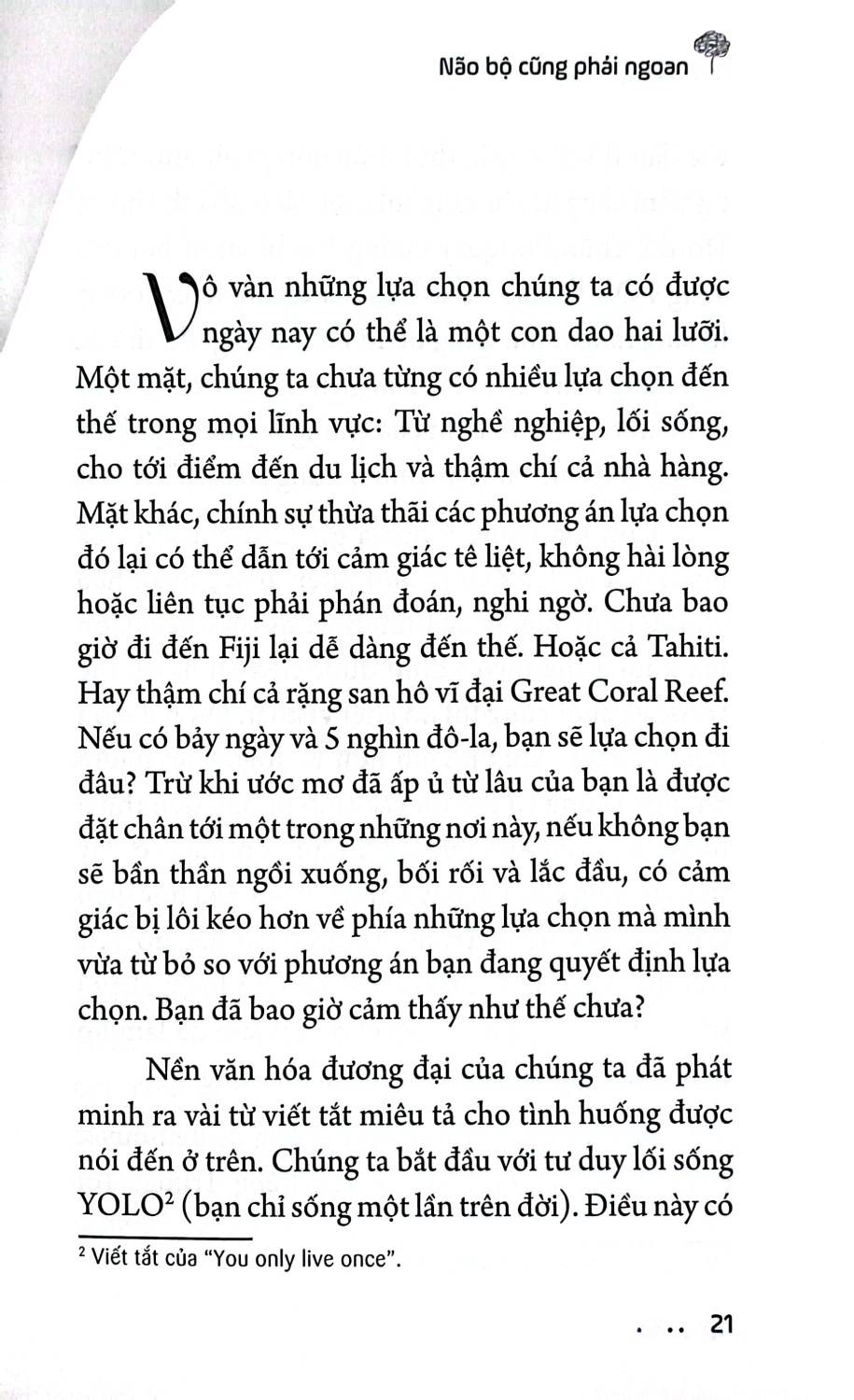 Não Bộ Cũng Phải Ngoan THÔNG TIN TÁC GIẢ: Zoe Mckey là tác giả có sách bán chạy nhất trong lĩnh vực phát triển bản thân, đồng thời là huấn luyện viên giao tiếp lối sống. Trong những cuốn sách chân thực và truyền cảm hứng của mình, Zoe nói về những gì cô tin là trở ngại đối với việc hưởng thụ cuộc sống bạn hằng mong muốn. Cô chia sẻ những phương pháp hay nhất nhằm giúp người đọc phát triển thói quen tốt, kiểm soát sự lo lắng, giảm bớt suy nghĩ và giải phóng bản thân khỏi sự tiêu cực cũng như sự kỳ vọng của người khác. Zoe nói lưu loát năm thứ tiếng. Cô có bằng cử nhân và thạc sĩ chuyên ngành nghiên cứu quốc tế và xã hội. Khi không thực hiện sứ mệnh thay đổi thế giới, cô thích đọc sách, vẽ, chơi piano, tập thể dục và tập yoga… TÓM TẮT NỘI DUNG Trí não của chúng ta đôi khi rất giống một đứa trẻ hay la cà đây đó theo tiếng gọi của những thú vui nhất thời mà không chuyên tâm vào nhiệm vụ cần làm, đồng thời rất bốc đồng và ưa gây chuyện; có lúc lại như một người già cả, trở nên trì trệ, thiếu linh hoạt giữa chốn xô bồ, thiên biến vạn hóa. “Đứa trẻ” cần được dạy dỗ để trở nên chú tâm hơn, đạt được hạnh phúc sâu sắc, bền vững nhờ hoàn thành công việc. Bộ não cũng cần trở nên bĩnh tĩnh và trưởng thành hơn trước mọi biến cố của cuộc sống. “Người già” thì cần rèn luyện nhiều để vượt quan sự trì trệ, bớt bám víu vào những cài đặt mặc định cứng nhắc trong tâm trí để đề ra những giải pháp phù hợp với tình huống hoàn cảnh. Là một người hiểu rất rõ về khoảng cách giữa nỗ lực và thành tựu, Zoe Mckey sẽ vận dụng kiến thức sâu sắc và tài hướng dẫn khéo léo của mình để cung cấp các công cụ và chiến lược hữu hiệu nhằm giúp trí não đi vào nề nếp, kỷ luật. Qua đó, bạn có thể chịu trách nhiệm tốt hơn với hạnh phúc của chính mình và sống một cuộc đời mà bạn hằng mong ước.