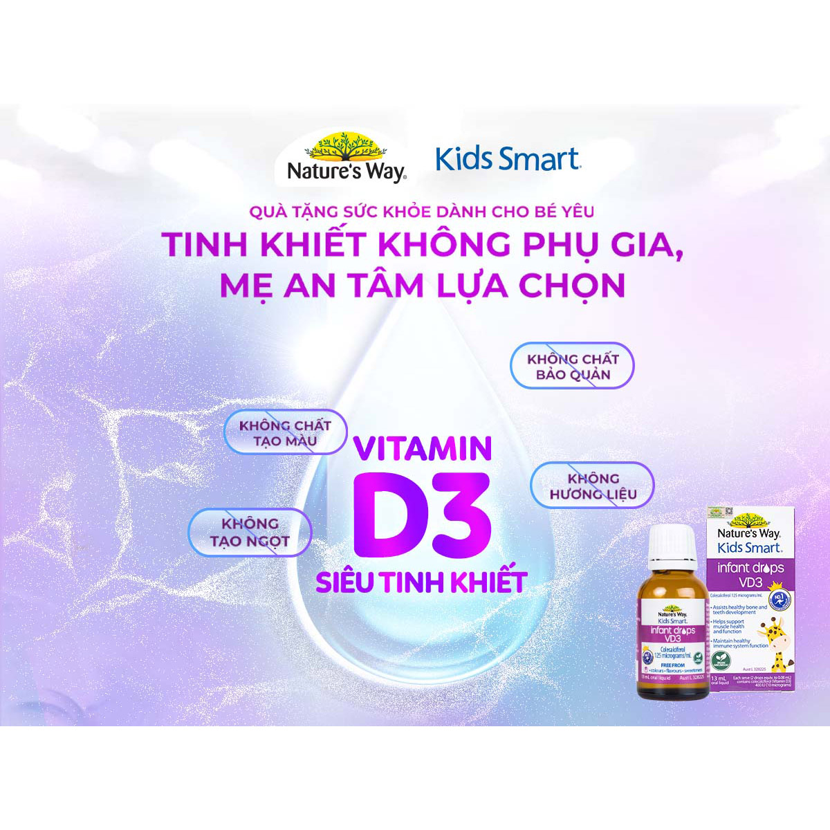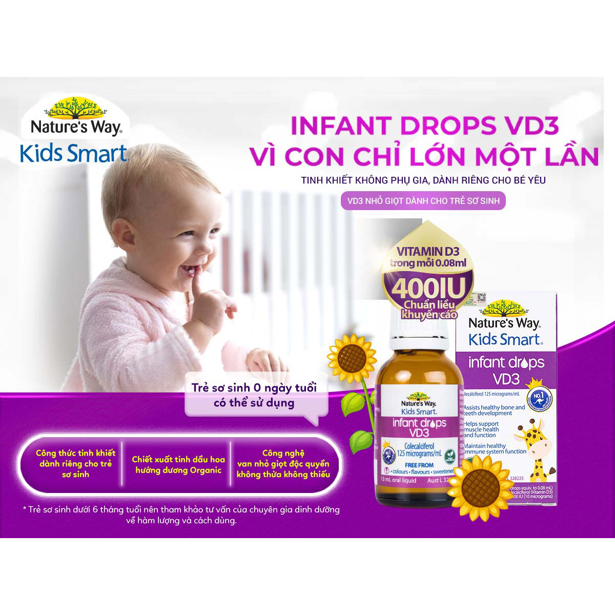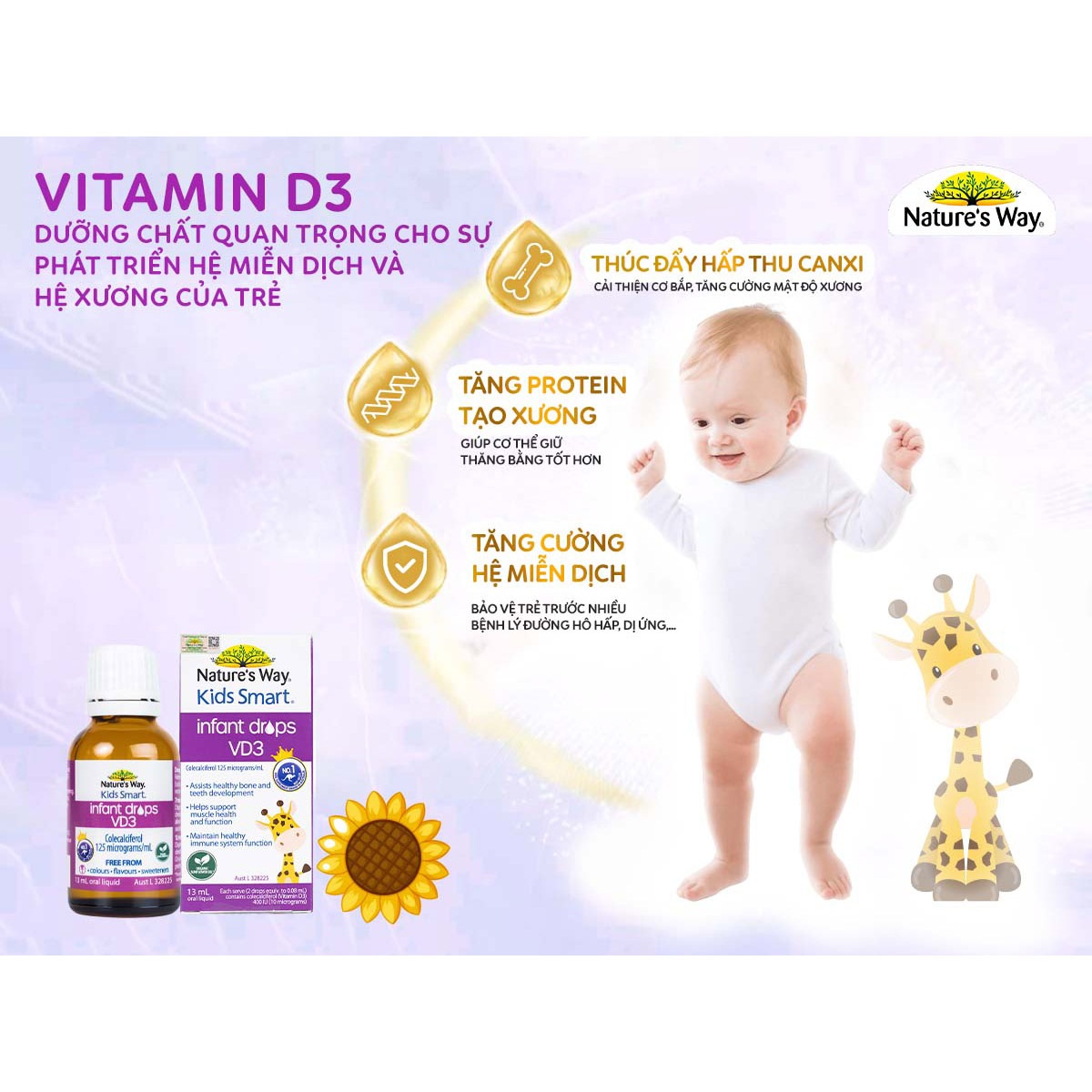 VITAMIN D3 THUẦN ORGANIC CHO TRẺ SƠ SINH NATURE'S WAY KIDS SMART INFANT DROPS VD3 CÔNG DỤNG - Hỗ trợ bổ sung Vitamin D3 giúp hấp thụ Canxi, hỗ trợ xương và răng chắc khỏe. THÀNH PHẦN Cho 1 ml dạng