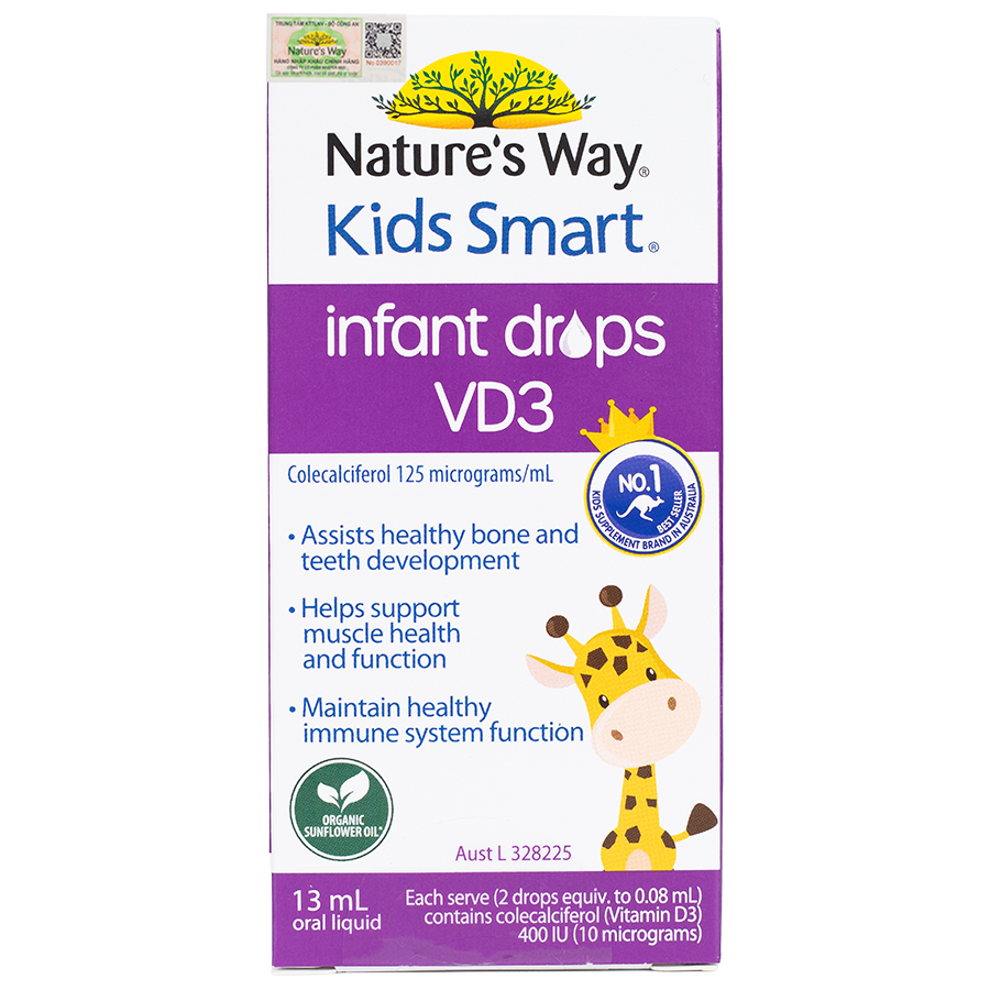 Nature's Way Kids Smart INFANT DROPS VD3 - Bổ sung vitamin D3 cho bé (13ml/Lọ)Giới thiệuNature's Way Kids Smart INFANT DROPS VD3 là sản phẩm bổ sung vitamin D3 dạng nhỏ giọt, được đặc chế dành riên...