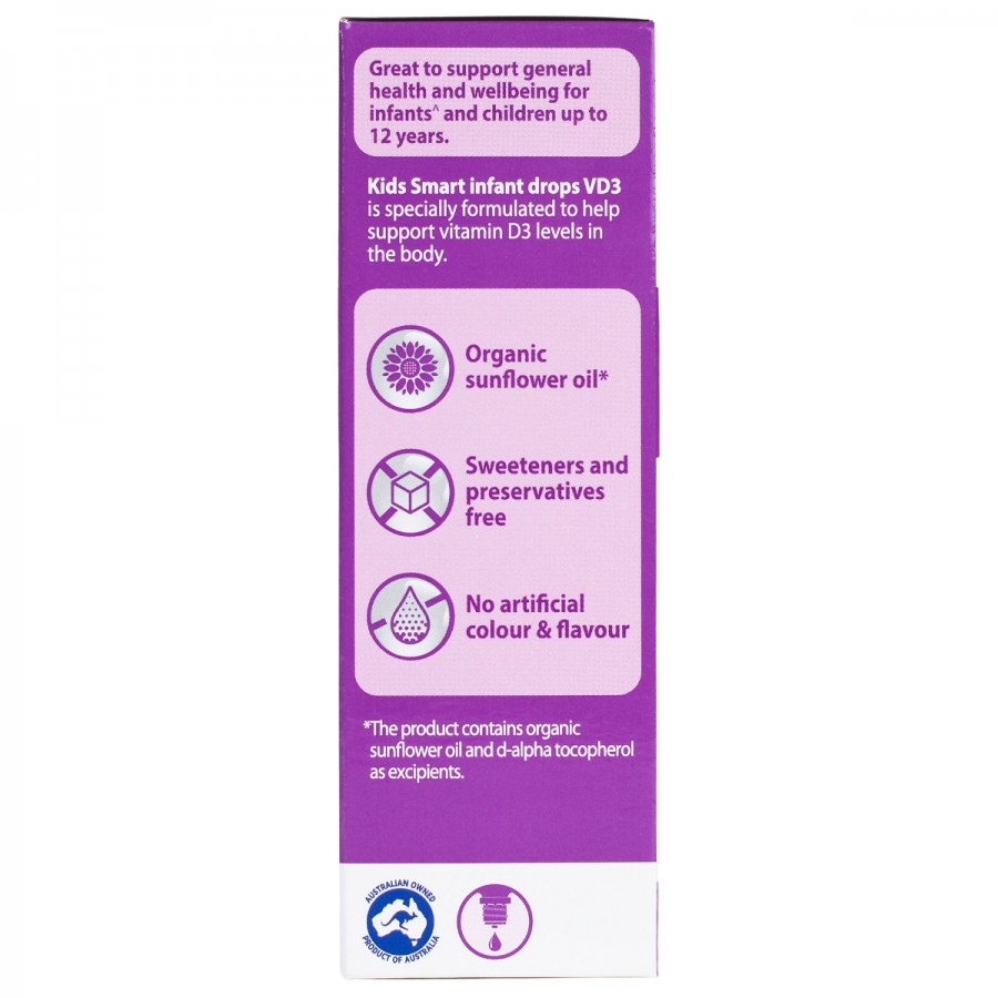 Nature's Way Kids Smart INFANT DROPS VD3 là sản phẩm bổ sung vitamin D3 dạng nhỏ giọt, được đặc chế dành riêng cho trẻ sơ sinh và trẻ nhỏ. Sản phẩm này cung cấp một lượng vitamin D3 cần thiết hàng ngày, giúp hỗ trợ sự phát triển xương chắc khỏe và hệ miễn dịch khỏe mạnh cho bé.