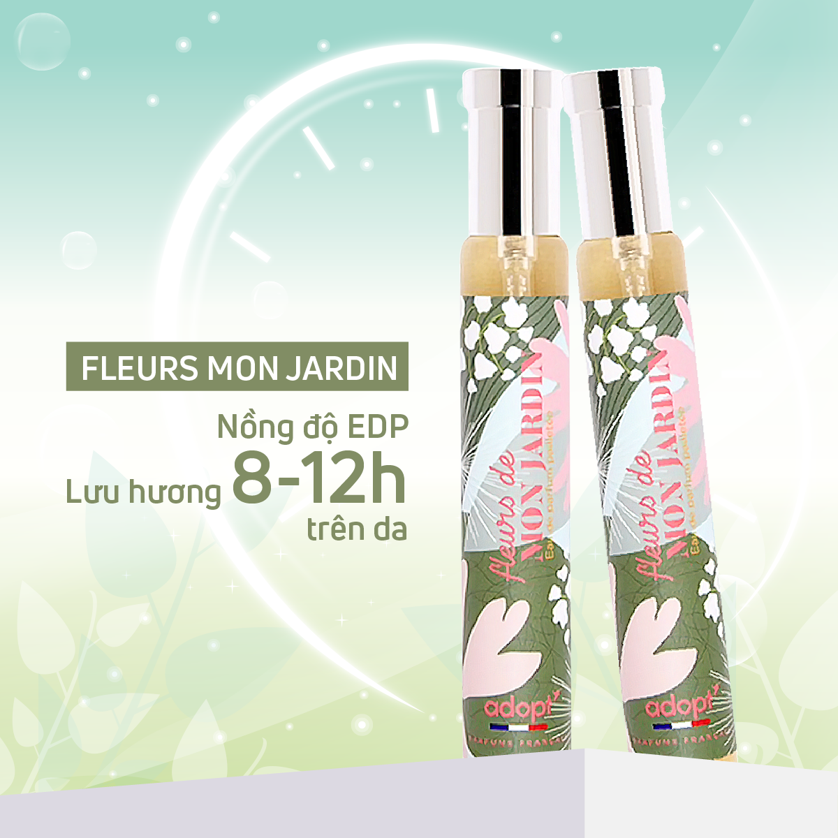 - 98% nguyên liệu thiên nhiên được sản xuất trực tiếp từ kinh đô nước hoa Grasses Dạo bước trong khu vườn hoa của Adopt’ với hương thơm Fleur de Mon Jardin. Hương thơm ngọt ngào kiêu sa của hoa mộc lan được hòa quyện cùng hương hoa táo tinh khiết thêm chút hương tựa trái mơ của hoa mộc. Tất cả được điểm xuyết lại với vị mặn nhẹ của muối. Một hương thơm ngọt ngào, dịu êm của cả một vườn hoa vô cùng trong trẻo và tươi mới. HƯỚNG DẪN SỬ DỤNG