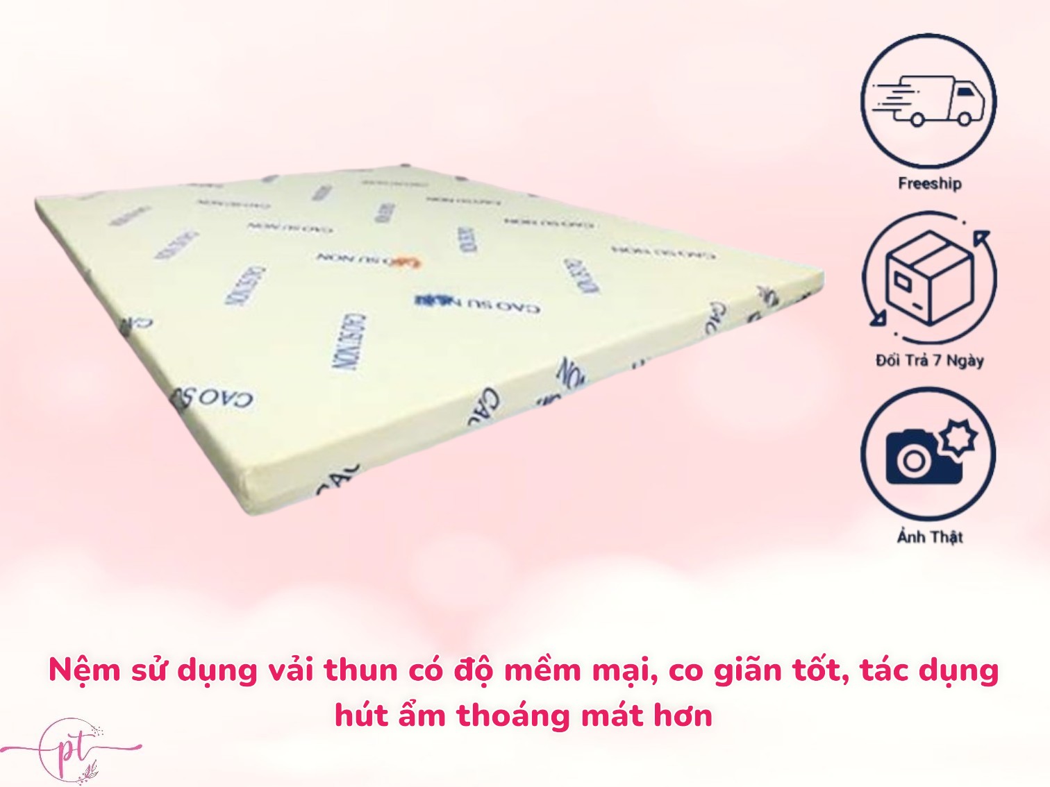 CAM KẾT: Cam kết đổi trả nếu hàng không giống mô tả và hoàn tiền 100% nếu sản phẩm lỗi. ────()()()────()()()──── Cấu tạo nệm Chất liệu: Được làm từ chất liệu Foam và Mousse Ép theo một tỷ lệ thích hợp, giúp tăng độ đàn hồi cũng như sự êm ái. Bề mặt nệm: Hai mặt nệm thiết kế hàng nghìn lỗ thông hơi tròn nhỏ, giúp thoáng khí cũng như độ ổn định khi đặt nệm trên mặt phẳng cao hơn. Lớp áo nệm: Sử dụng vải thun có độ mềm mại, co giãn tốt, tác dụng hút ẩm thoáng mát hơn. Những ưu điểm vượt trội của nệm cao su non Casumax Độ đàn hồi cao mang lại cảm giác êm ái, giúp nâng đỡ và bảo vệ cơ thể, thích hợp cho người bị đau cột sống, đau lưng khó ngủ lâu ngày. Giảm đau trên các điểm thường chịu áp lực khi ngủ trên những bề mặt cứng như lưng và vai. Bạn có thể thay đổi tư thế nằm thoải mái mà không lo nệm phát ra tiếng động khó chịu. Mang lại cảm giác thông thoáng dễ chịu, không hầm bí cho người sử dụng nhờ hàng ngàn những lỗ thông hơi. Trọng lượng vừa phải, bạn có thể dễ dàng di chuyển cũng như vệ sinh khi cần. Giá thành rẻ, phù hợp kinh tế của mọi gia đình hiện nay. Độ bền lâu dài theo thời gian. ────()()()────()()()────