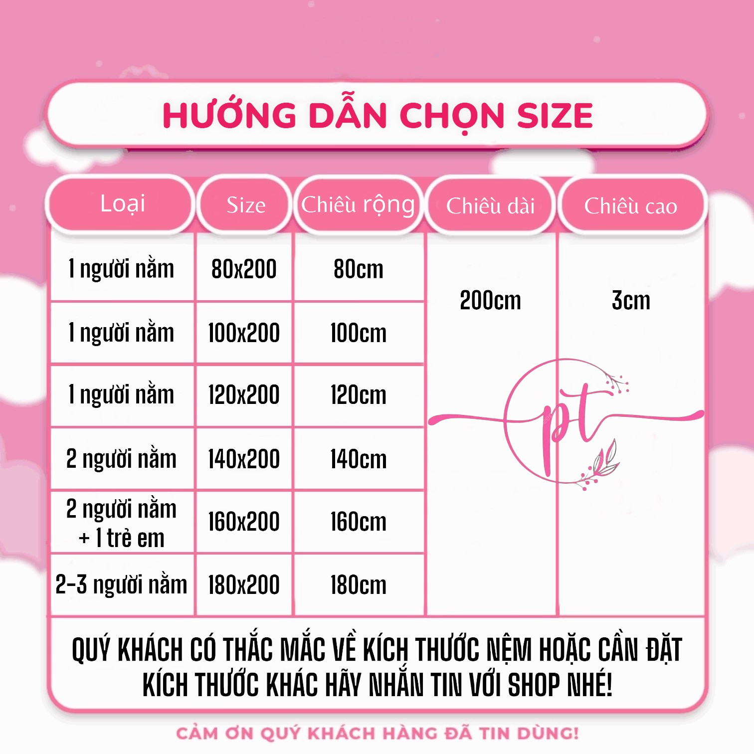 Kích thước: Nệm có các kích thước: 80x200x3(cm), 100x200x3(cm), 120x200x3(cm) 140x200x3(cm), 160x200x3(cm), 180x200x3(cm).