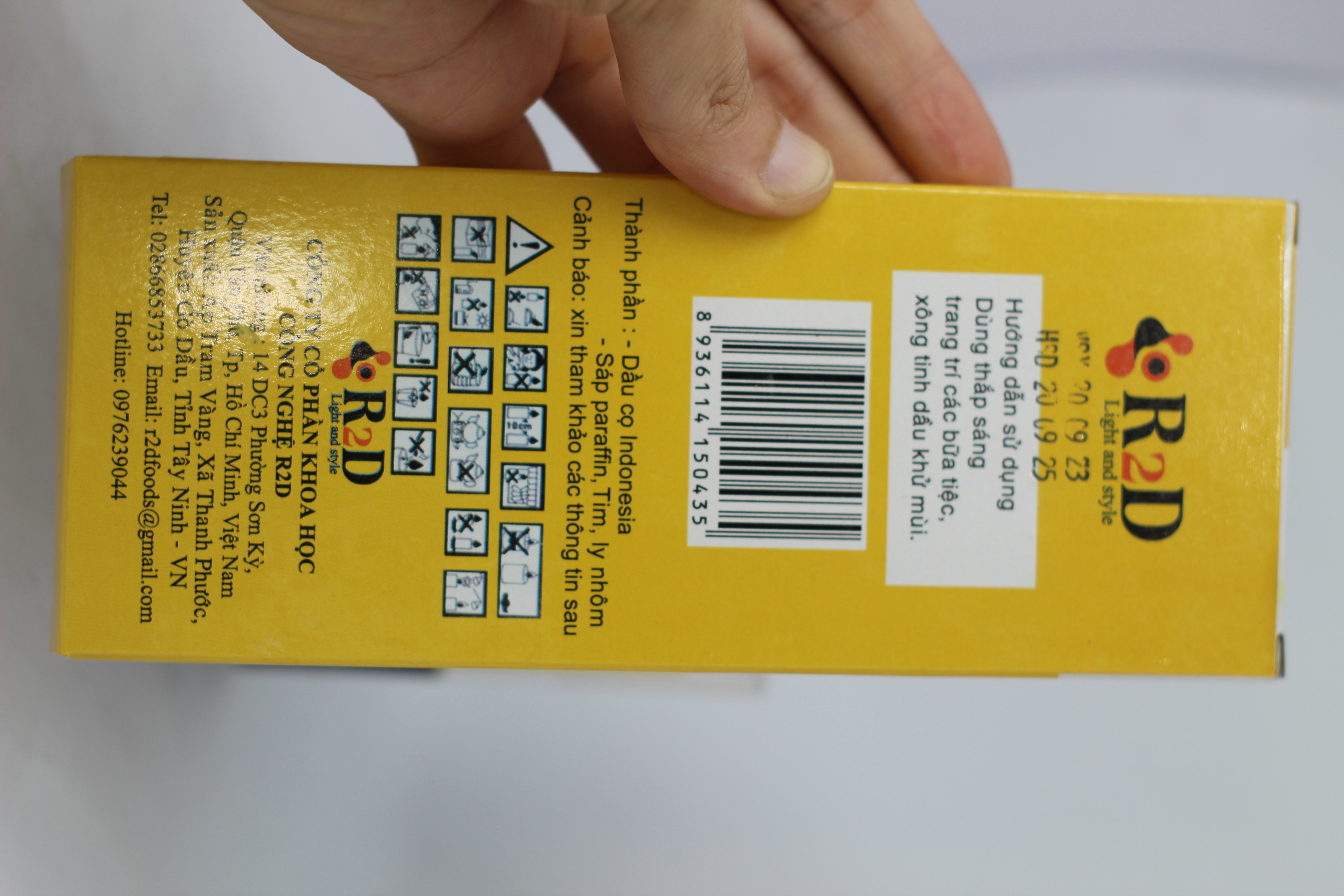 Nến Không Khói Vàng, Tealight Vàng, Nến Trà , [Vỉ 10 Viên], Chính Hãng Từ Thương Hiệu R2D, Làm Từ Nguyên Liệu Tự Nhiên, Lành Tính. - Nến Không Khói, Vàng dùng thắp sáng, trang trí, trang trí nội thất, sân vườn, tiệc cưới. Là sản phẩm cần thiết để dùng với đèn xông tinh dầu. - Nến khi đốt dễ chịu, thoải mái, không khói, không mùi, cháy sạch không tàn, không bị tắt trong lúc cháy. - Sử dụng tốt cho những người dị ứng với mùi hương hoặc kết hợp với đèn xông tinh dầu để tạo mùi thơm, khử sạch mùi hôi, đuổi côn trùng, làm không khí trong lành. Thành phần: Dầu cọ, sáp dừa organic. Định lượng: 100 g (7.5x19x1.5). Thời gian đốt: 4 giờ trong điều kiện phù hợp. - Kiểu dáng nến đẹp mắt, ấn tượng tạo sự sinh động, tinh tế cho không gian của bạn, có thể dùng cho gian phòng, gia đình, nhà hàng, khách sạn… - Nến Không Khói được làm hoàn toàn từ tinh chất tự nhiên kết hợp với sáp cọ organic cao cấp. HƯỚNG DẪN SỬ DỤNG NẾN - Đốt trực tiếp hoặc sử dụng chung với đèn xông tinh dầu. - Có thể tái sử dụng nhiều lần . - Bảo quản nơi khô ráo thoáng mát, tránh nhiệt độ cao.