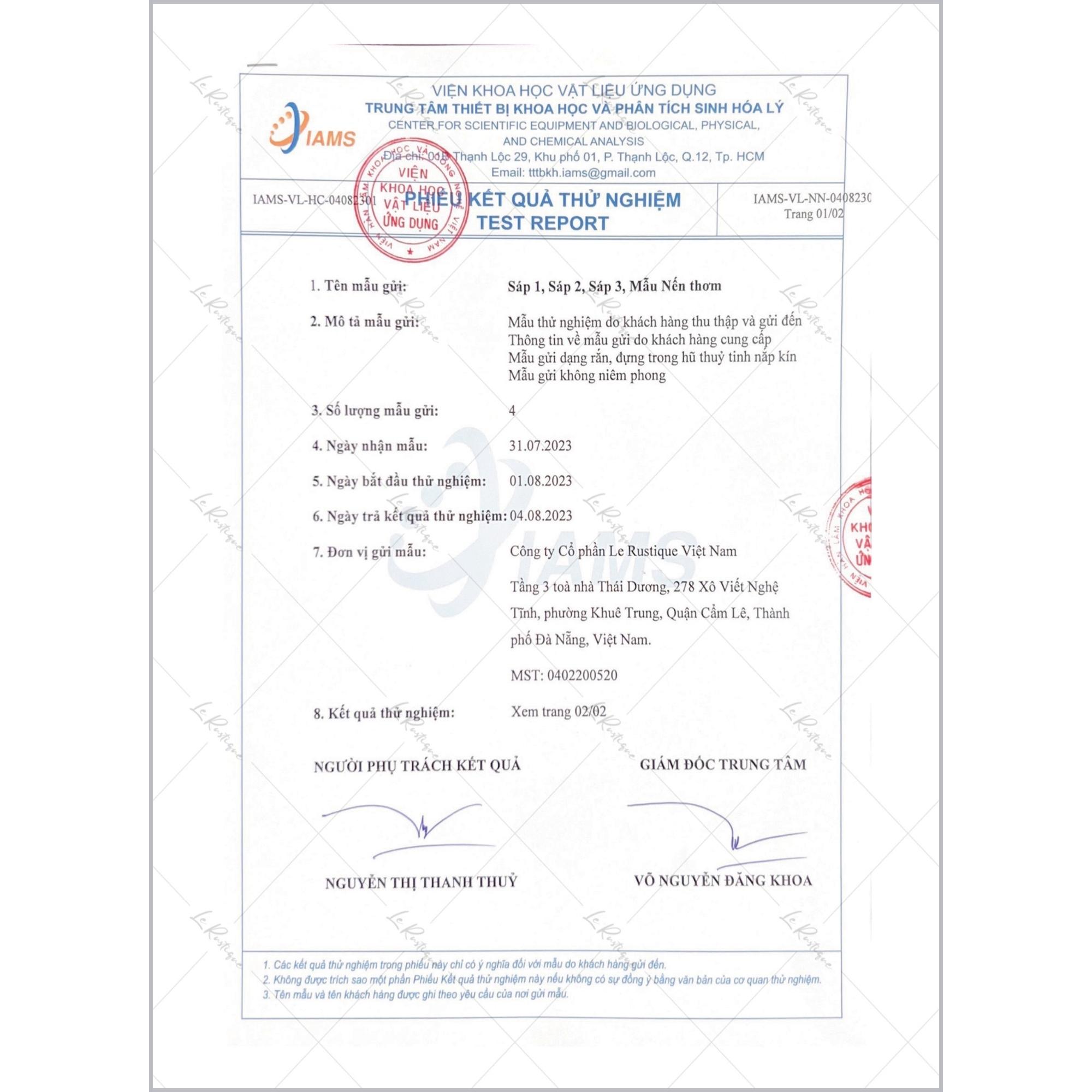 • Hương cuối: Quế GỢI Ý SỬ DỤNG Sử dụng khi bạn cần thư giãn và xả stress sau một ngày bận rộn, hoặc khi bạn muốn tạo không gian thư giãn cho việc đọc sách hoặc tập yoga. Đặc biệt: Tất cả các mùi hương của Le Rustique đều mang đến sự thư giãn và trị liệu, tuy nhiên, mỗi loại mùi hương có sự đặc trưng riêng giúp bạn tạo nên trải nghiệm độc đáo.  THÀNH PHẦN SÁP VÀ THỜI GIAN CHÁY