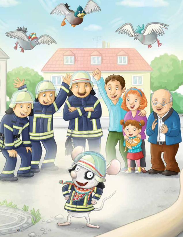 “Đó là từ trạm cứu hỏa”, Nevio kêu lên. “Nhất định là có đám cháy ở đâu đó! Đi nào Erik, hãy đưa tớ bay lên cao để tớ có thể nhìn được xa hơn!” Nevio nhanh nhẹn leo lên lưng bạn và Erik cất cánh bay lên. Quả đúng vậy: Ngay trước trạm cứu hỏa ở rìa công viên có một chiếc xe cứu hỏa rất to màu đỏ, đèn hiệu màu xanh lam đang nhấp nháy liên hồi.