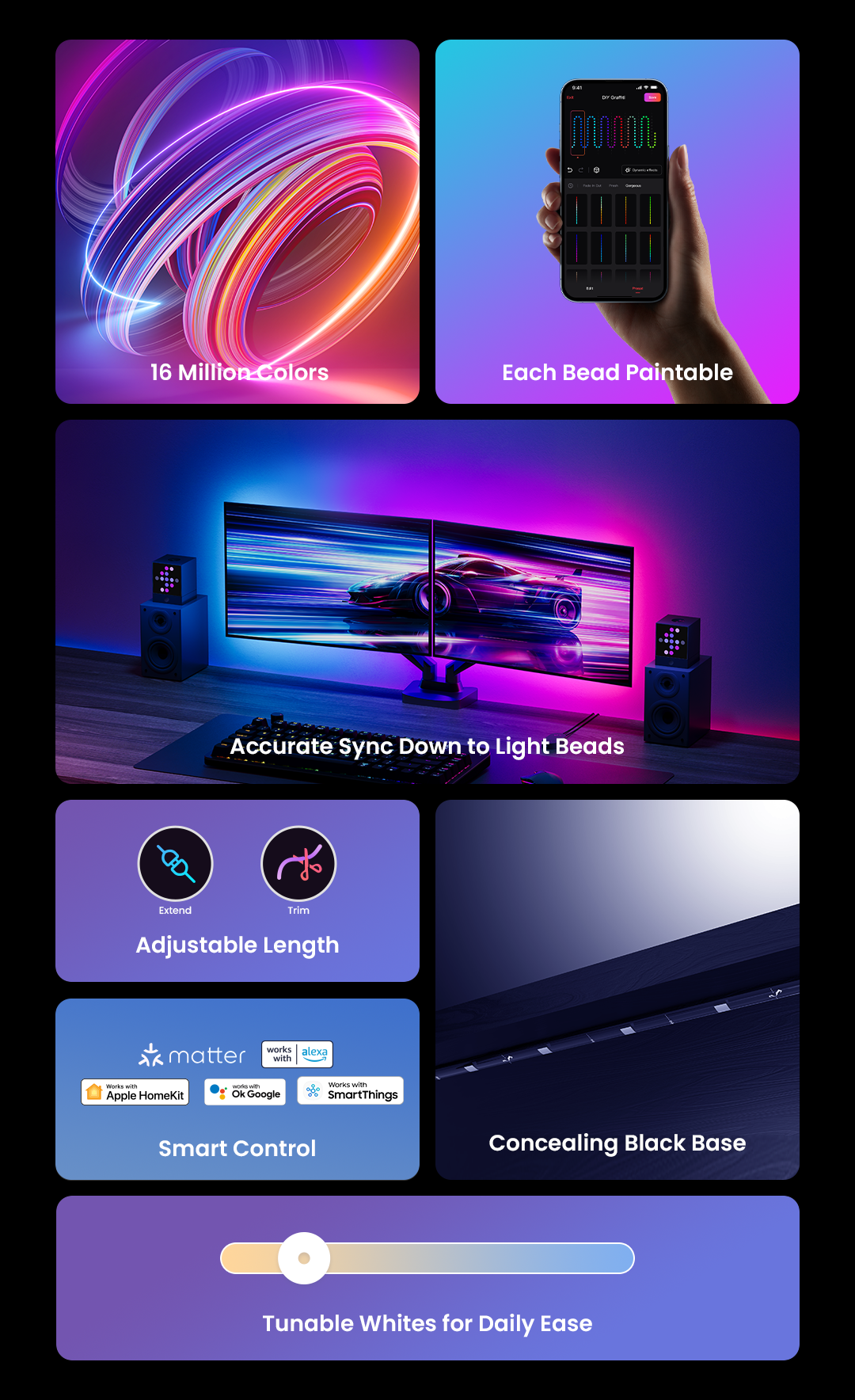 Dải LED Pro có một chip IC tích hợp, có thể hiển thị đồng thời các màu RGB khác nhau trong cùng một dải cùng 1 thời điểm để khắc họa những khoảnh khắc riêng và góp phần làm không gian thêm sống động, dễ dàng sync với màn hình tivi/máy tính, đổi màu theo âm nhạc, đặc biệt tích hợp với Razer Chroma khiến trải nghiệm chơi game nhập vai hơ