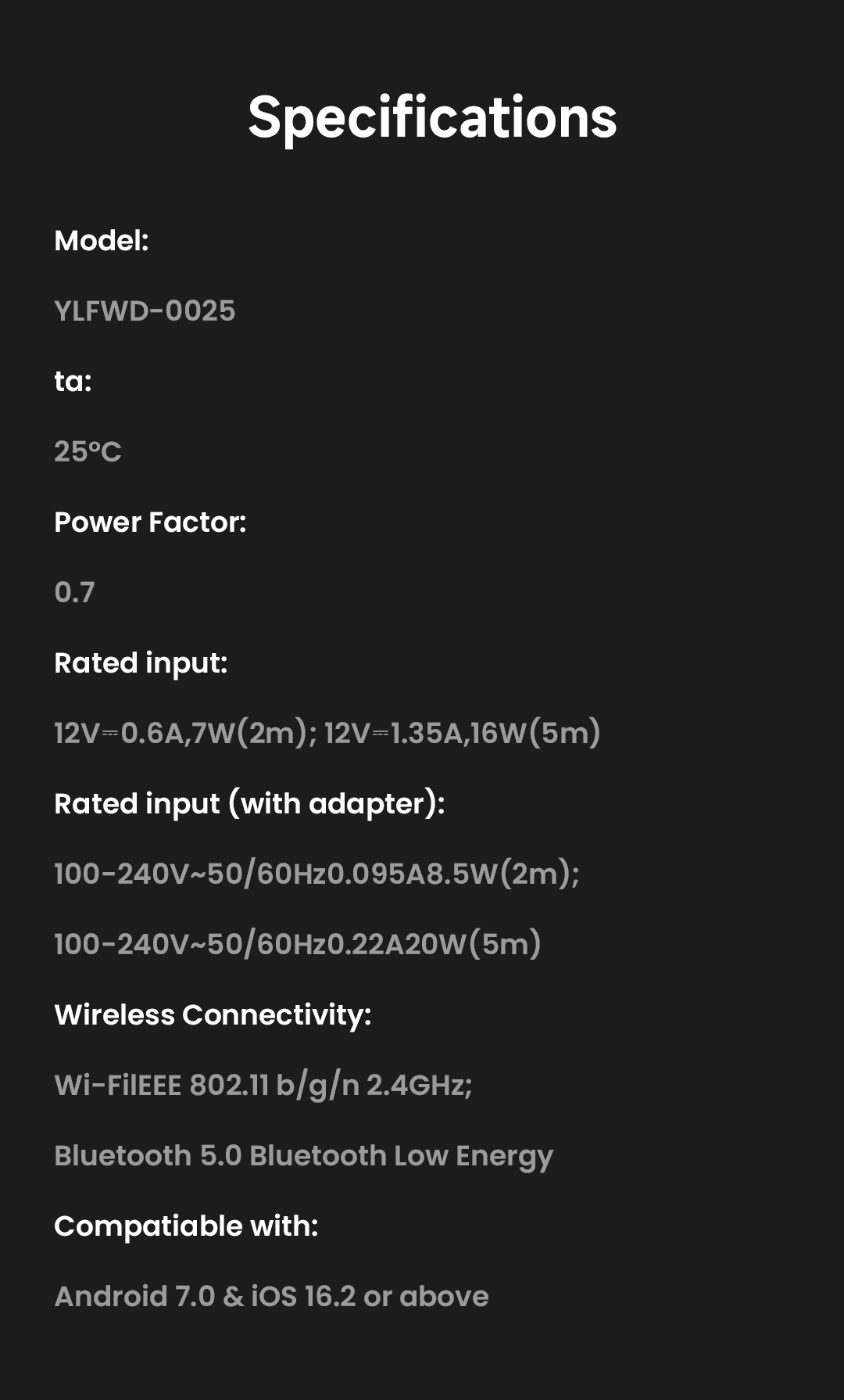 Công suất định mức: 7W (2m); 16W (max 5m)