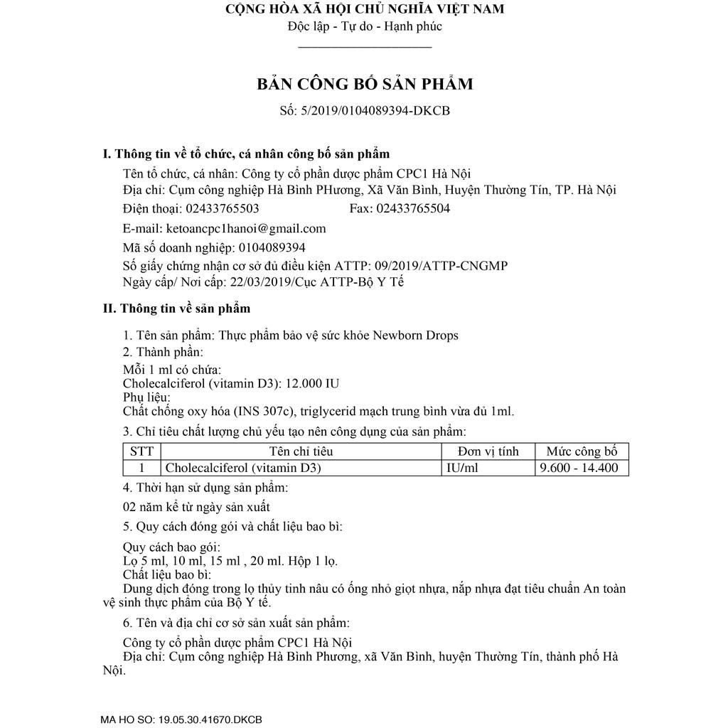 NEWBORN DROPS1/ Thành PhầnCholecalciferol (Vitamin D3) 12000 IUChất chống oxy hóa (INS 307c),Triglycerid mạch trung bình vừa đủ 1ml.2/ Công dụng:+) Bổ sung VITAMIN D+) Giúp tăng cường hấp thụ c...