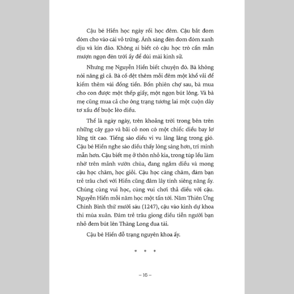 Ông Nguyễn Hiền đây rồi! Một tiếng dạ trong trẻo cất lên. Một cậu bé trạc mười ba tuổi, tóc còn để trái đào, mặc một bộ áo nâu thẫm màu vỏ già của người vùng biển. Tay cậu còn cầm một cuộn dây tơ nhỏ, thứ dây thường dùng để buộc lèo diều.”