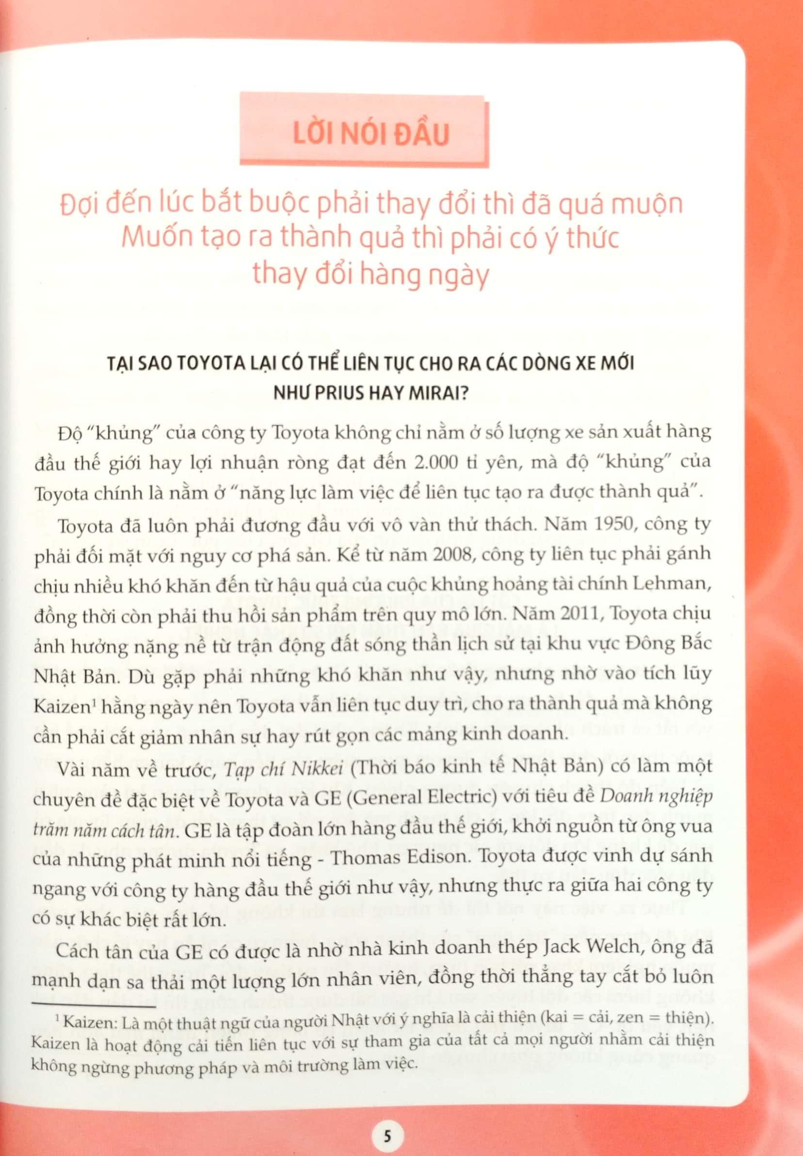 Trong quá trình miệt mài không ngừng xây dựng và trưởng thành của m.ình, Toyota đã luôn phải đương đầu với vô vàn thử thách. Năm 1950, công ty phải đối mặt với nguy cơ phá sản. Kể từ năm 2008, công ty liên tục phải gánh chịu nhiều khó khăn đến từ hậu quả của cuộc khủng hoảng tài chính Lehman, đồng thời thu hồi sản phẩm trên quy mô lớn. Năm 2011, Toyota còn phải chịu ảnh hưởng nặng nề từ trận động đất sóng thần lịch sử tại khu vực Đông Bắc Nhật Bản. Dù gặp phải những khó khăn như vậy, nhưng nhờ vào tích lũy Kaizen hằng ngày nên Toyota vẫn liên tục duy trì, cho ra thành quả mà không cần phải cắt giảm nhân sự hay rút gọn các mảng kinh doanh.