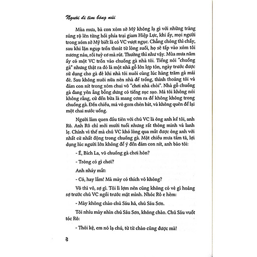 Có một hậu phương miền Nam rừng rực lửa chết chóc đau thương trong cuộc chiến ở Việt Nam giai đoạn 1954-1975. Mà thủ phạm là chiến tranh- một cuộc chiến không khoan nhượng giữa hai làn tên mũi đạn. Đọc Người Đi Tìm Bóng Núi của Thu Trân để biết giá trị của hoà bình, để biết những chập chùng và day dứt của các luồng tư tưởng khác nhau trước khi non sông về một mối.