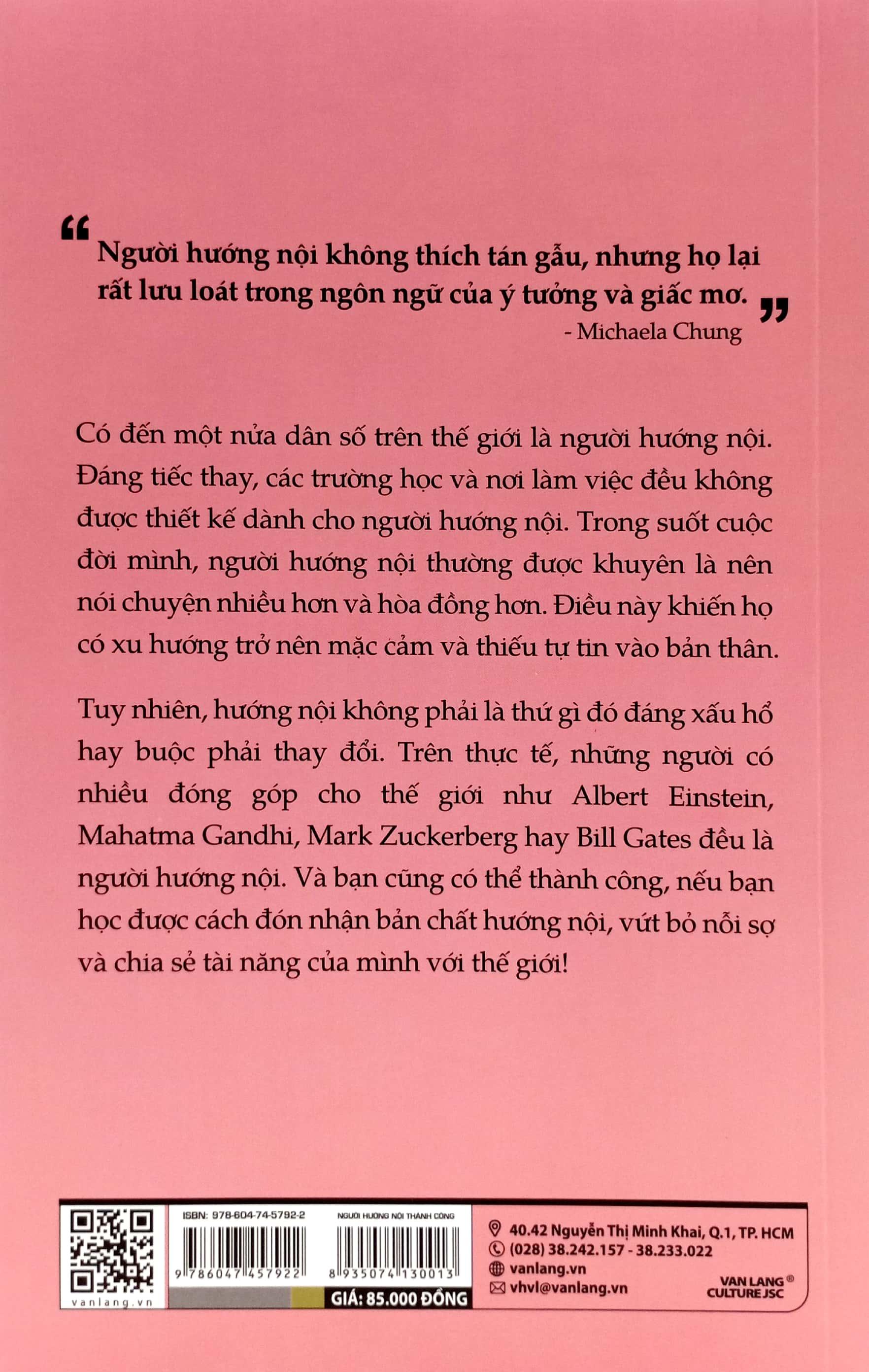 - Michaela Chung.Có đến một nửa dân số trên thế giới là người hướng nội. Đáng tiếc thay, các trường học và nơi làm việc đều không được thiết kế dành cho người hướng nội. Trong suốt cuộc đời m.ình, người hướng nội thường được khuyên là nên nói chuyện nhiều hơn và hòa đồng hơn. Điều này khiến họ có xu hướng trở nên mặc cảm và thiếu tự tin vào bản thân. Tuy nhiên, hướng nội không phải là thứ gì đó đáng xấu hổ hay buộc phải thay đổi. Trên thực tế, những người có nhiều đóng góp cho thế giới như Albert Einstein, Mahatma Gandhi, Mark Zuckerberg hay Bill Gates đều là người hướng nội. Và bạn cũng có thể thành công, nếu bạn học được cách đón nhận bản chất hướng nội, vứt bỏ nỗi sợ và chia sẻ tài năng của m.ình với thế giới!