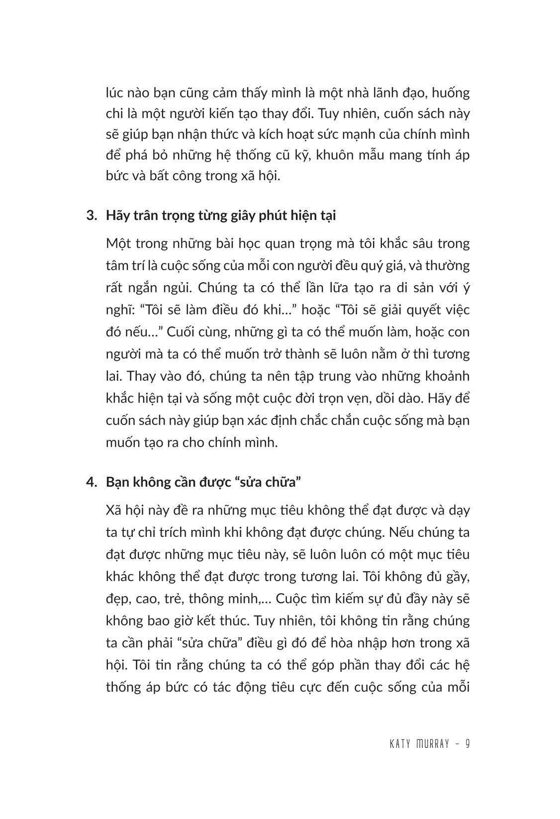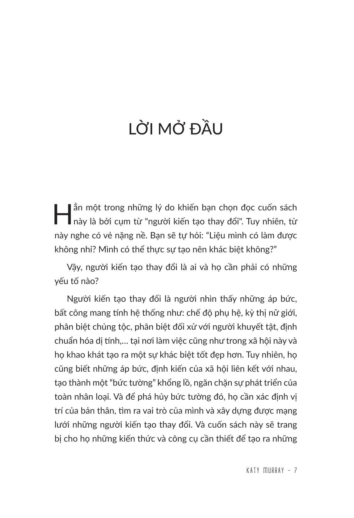Với 25 năm kinh nghiệm tư vấn cho các nhà lãnh đạo trên toàn thế giới, Katy Murray sẽ dẫn dắt bạn qua hành trình tái kết nối với ý niệm về mục đích và sắp xếp lại các lựa chọn của mình trong sự nghiệp. Người kiến tạo thay đổi sẽ tái định hình tư duy của bạn về định kiến chốn công sở, giúp bạn khám phá sức mạnh nội tại và học cách sử dụng chúng để kiến tạo nên những đột phá trong sự nghiệp. Qua đó, bạn sẽ nâng tầm ảnh hưởng của mình để tiến xa hơn trong việc xây dựng cuộc sống mong muốn và bước lên vị trí nhà lãnh đạo tiên phong.