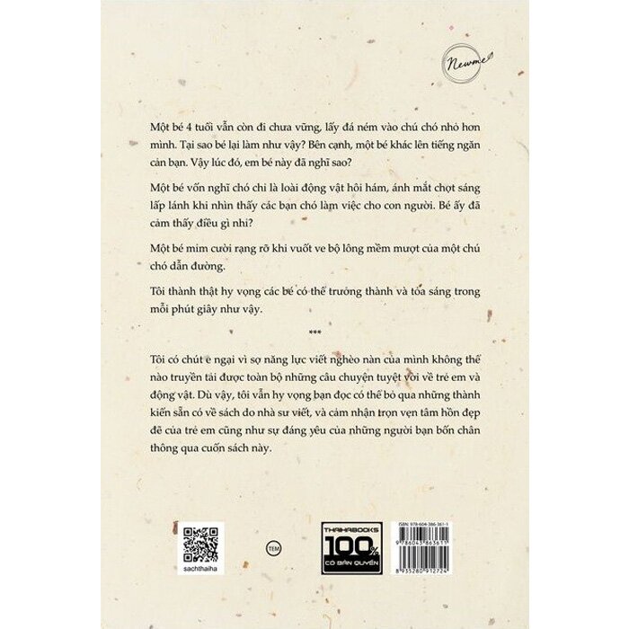 Một bé bốn tuổi vẫn còn đi chưa vững, lấy đá ném vào chú chó bé nhỏ hơn mình. Tại sao bé lại làm như vậy? Bên cạnh, một bé khác lên tiếng ngăn cản bạn. Vậy lúc đó, em bé này đã nghĩ sao? Một bé vốn nghĩ chó chỉ là loài động vật hôi hám, ánh mắt chợt sáng lấp lánh khi nhìn thấy các bạn chó làm việc cho con người. Bé ấy đã cảm thấy điều gì nhỉ? Một bé mỉm cười rạng rỡ khi vuốt ve bộ lông mềm mượt của một chú chó dẫn đường. Tôi thành thật hy vọng các bé có thể trưởng thành và tỏa sáng trong mỗi phút giây như vậy. Đồng hành cùng tôi và các bé là ba chú chó trắng, chó dẫn đường, chó nghiệp vụ của trang trại sản xuất thực phẩm cho chó và cha mẹ, ông bà của các bé – những người đang hoan nghênh, cổ vũ các em cũng như nỗ lực của các cô giáo ở trường mầm non. Tôi có chút e ngại vì sợ năng lực viết nghèo nàn của mình không thể nào truyền tải được toàn bộ những câu chuyện tuyệt vời về trẻ em và động vật. Dù vậy, tôi vẫn hy vọng bạn đọc có thể bỏ qua những thành kiến sẵn có về sách do nhà sư viết, và cảm nhận trọn vẹn tâm hồn đẹp đẽ của trẻ em cũng như sự đáng yêu của những người bạn bốn chân thông qua cuốn sách này.