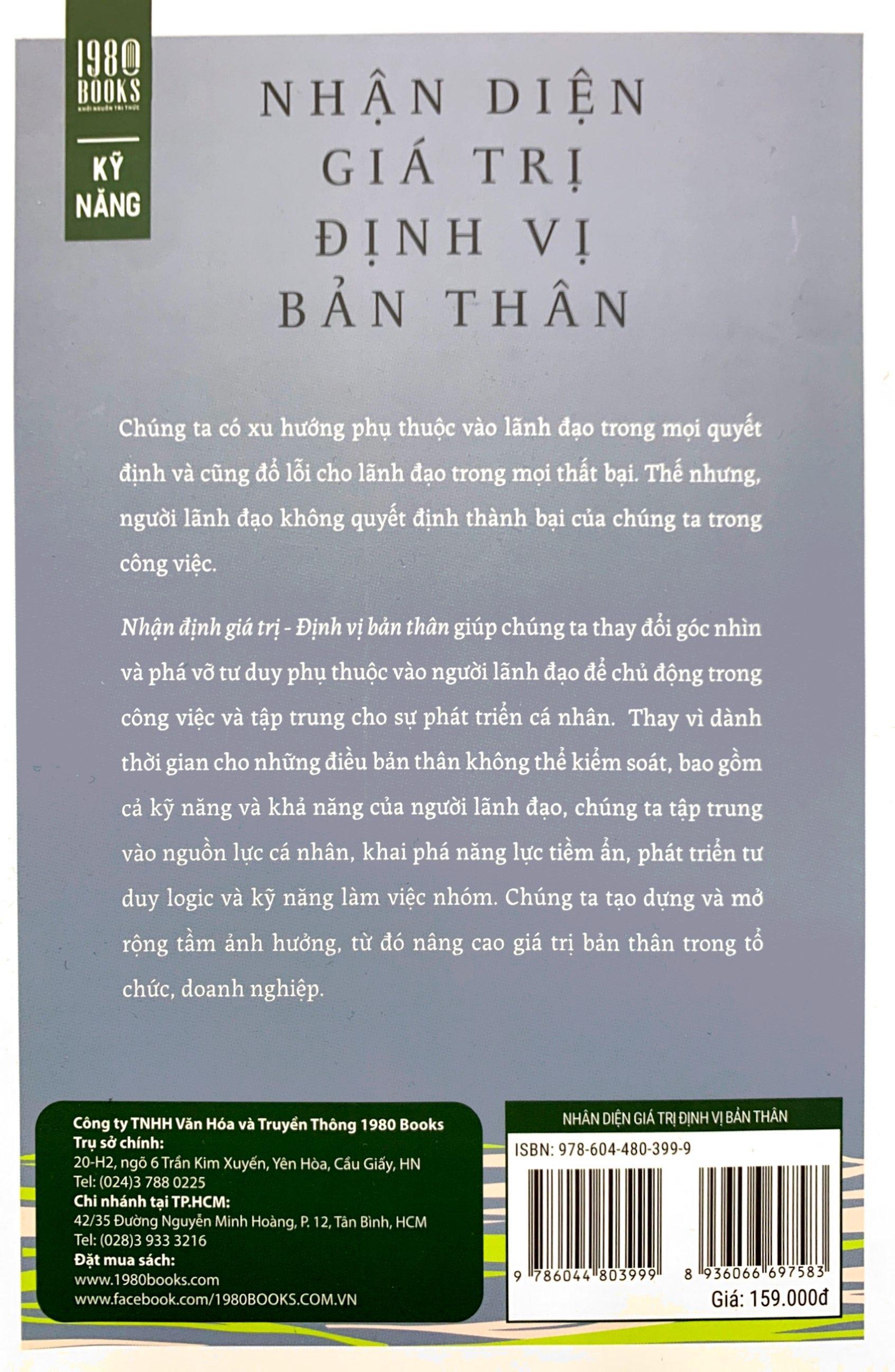 Cuốn sách « Nhận diện giá trị - Định vị bản thân » tiếp cận chủ đề lãnh đạo theo một cách hoàn toàn khác. Lãnh đạo không nằm ở vị trí mà ở vị thế và thái độ. Bạn không cần phải là Chủ tịch hoặc Trưởng phòng mới được gọi là người lãnh đạo và chứng minh khả năng lãnh đạo hiệu quả. Bạn có thể tạo ra tác động tích cực thông qua việc tự lãnh đạo bản thân dù bạn đang ở vị trí nào.