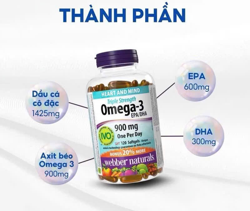 Xuất Xứ: Canada Thương Hiệu: Webber Natural Số Lượng: 120Viên Nang dễ nuốt - SẢN PHẨM: + Dầu cá Omega 3 Triple Strength 900 mg With CoQ10 cung cấp 600 mg EPA và 300 mg