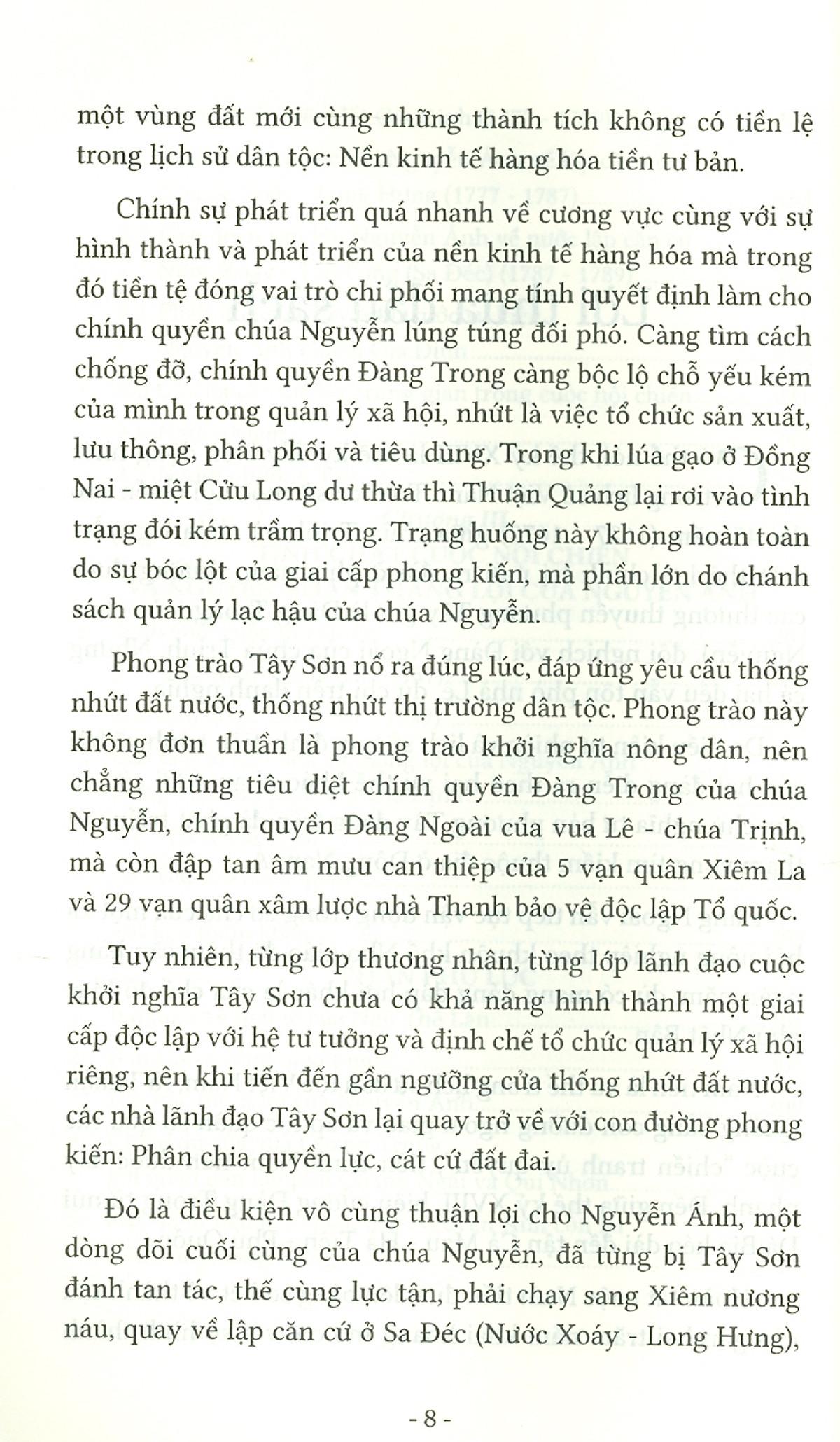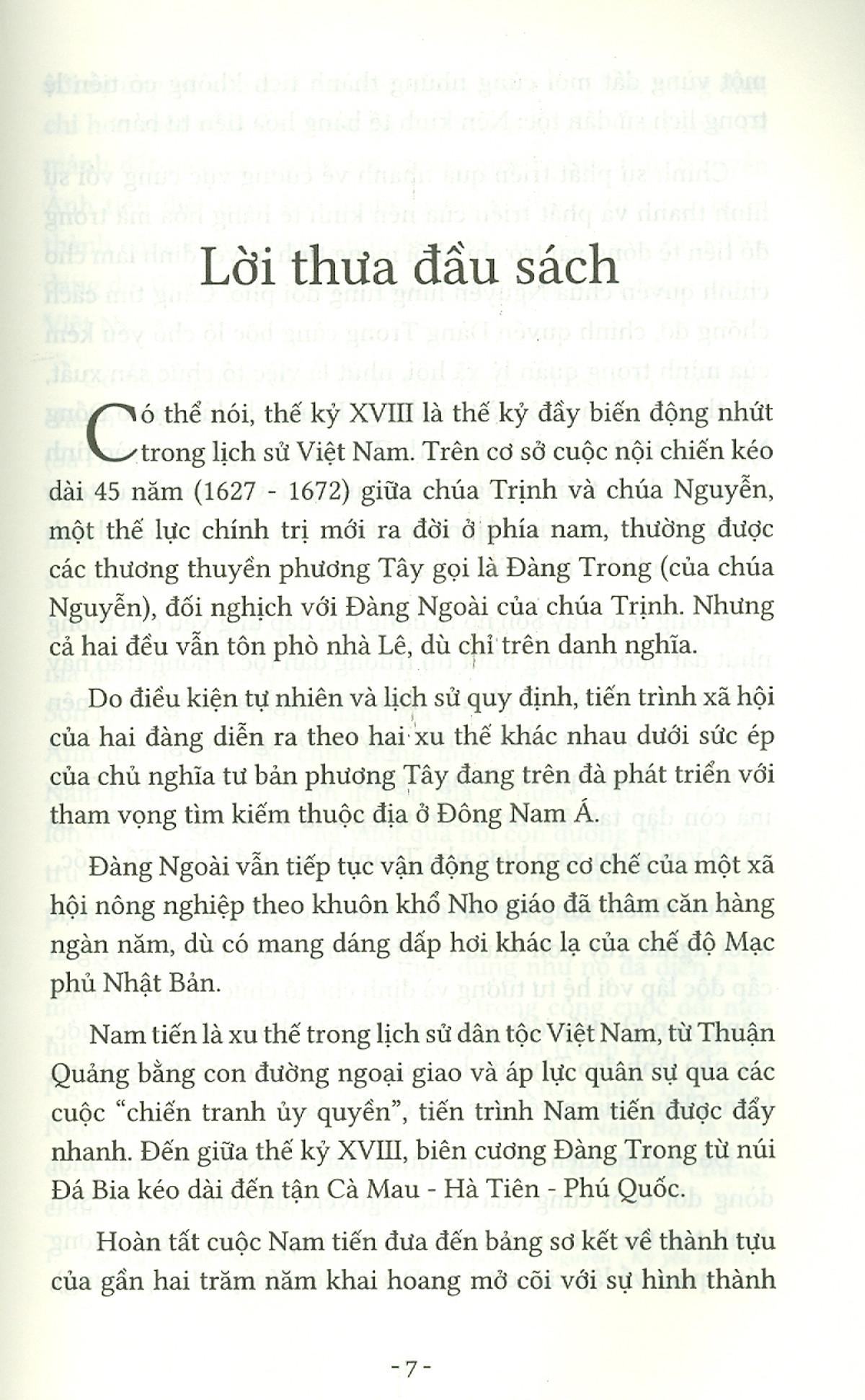 Có thể nói, thế kỷ XVIII là thế kỷ đầy biến động nhất trong lịch sử Việt Nam. Trên cơ sở cuộc nội chiến kéo dài 45 năm (1627 - 1672) giữa chúa Trịnh và chúa Nguyễn, một thế lực chính trị mới ra đời ở phía nam, thường được các thương thuyền phương Tây gọi là Đàng Trong (của chúa Nguyễn), đối nghịch với Đàng Ngoài của chúa Trịnh. Nhưng cả hai đều vẫn tôn phò nhà Lê, dù chỉ trên danh nghĩa. | Do điều kiện tự nhiên và lịch sử quy định, tiến trình xã hội của hai đang diễn ra theo hai xu thế khác nhau dưới sức ép của chủ nghĩa tư bản phương Tây đang trên đà phát triển với tham vọng tìm kiếm thuộc địa ở Đông Nam Á. | Đàng Ngoài vẫn tiếp tục vận động trong cơ chế của một xã hội nông nghiệp theo khuôn khổ Nho giáo đã thâm căn hàng ngàn năm, dù có mang dáng dấp hơi khác lạ của chế độ Mạc phủ Nhật Bản.