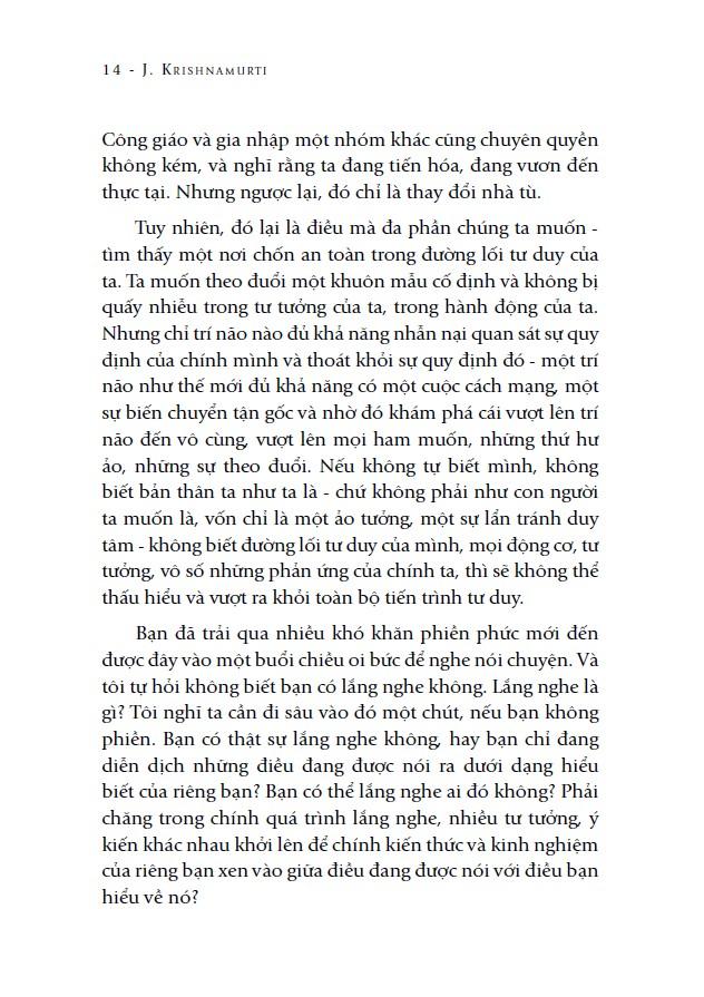 - Giải thoát tâm trí khỏi mọi sự quy định - Đã bao giờ bạn từng nghĩ, vì sao trên thế giới, có nơi chìm đắm trong nghèo khó nhưng cũng có nơi giàu có vô cùng? Vì sao những nỗ lực cải thiện bản thân, thôi thúc ta gặt hái thành công, lại đi kèm với những nỗi sợ hãi, thất bại và khổ đau? Theo triết gia Jiddu Krishnamurti, cấu trúc xã hội ngày nay được xây dựng dựa trên sự ganh tị, sự tích lũy, trong đó bao hàm sự tuân thủ, chấp nhận quyền lực, thỏa mãn tham vọng, mà về cốt lõi chính là cái “tôi”, cái bản ngã đang nỗ lực để trở thành điều gì đó. Xã hội được tạo nên từ chất liệu đó và nền văn hóa của nó – vui và khổ, đẹp và xấu, toàn bộ những nỗ lực của xã hội – quy định trí não con người. Vậy làm thế nào để tâm trí chúng ta thoát khỏi tất cả sự quy định này? Câu trả lời sẽ được tìm thấy trong quyển sách “Như ta là” (tựa gốc: “As One Is”) của Krishnamurti. Quyển sách tường thuật nội dung tám buổi nói chuyện có tính ngẫu hứng của Krishnamurti trước hàng trăm người, diễn ra dưới bóng râm của một rừng sồi nhỏ nơi thung lũng Ojai (California, Hoa Kỳ) vào mùa hè năm 1955. Tại đây, Krishnamurti đã dẫn dắt người nghe nhìn thẳng vào sự hỗn loạn, những thói quen và tư tưởng của một trí não bị ảnh hưởng bởi mọi sự quy định, đồng thời khám phá ra rằng đây là gốc rễ của mọi bạo lực cũng như khổ đau trên toàn thế giới. Xuyên suốt tác phẩm, Krishnamurti nhấn mạnh con đường duy nhất để khám phá ra sự thật cốt lõi của tất cả những điều trên, đi đến sự giải thoát, là tự biết mình; thấy chính ta như “ta là” trong thực tại, chứ không phải “ta phải là” hay “ta nên là”. Ông chỉ ra rằng bằng cách tự nhìn thấy trí não của mình đang bị chi phối ra sao bởi những uy quyền, khuôn khổ, phạm vi, truyền thống, quy định…, con người mới có thể thoát ra khỏi tất cả những điều đó. Một cách rốt ráo, Krishnamurti yêu cầu người nghe xem xét để nhận ra rằng tất cả mọi biểu hiện có vẻ tiến bộ của bản ngã không phải là sự tiến bộ dẫn đến tự do mà chỉ là guồng quay cũ của ảo tưởng; rằng sự hiểu biết trí não của chính mình, tự biết mình là con đường duy nhất dẫn đến tự do. Ông can đảm đối diện với những vấn đề thiết yếu của xã hội và dẫn dắt người nghe nhìn nhận chúng bằng minh triết để tự mình thấu hiểu, khám phá mọi sự thật bằng một tâm thức tự do hoàn toàn. Trong “Như ta là”, Krishnamurti đã lần lượt đề cập đến những vấn đề cốt lõi như: bản chất của bạo lực, vấn đề thay đổi, sự quy định của trí não, nền hòa bình thực sự, bản chất của sự sùng bái, sự tu tập tâm linh, và thế nào là thực sự lắng nghe… Ông cũng giúp cử tọa giải đáp một số thắc mắc “tại chỗ” như: dục vọng; tình trạng phạm tội ở tuổi thanh thiếu niên; bản chất của sự nhiễu loạn trong tâm trí; ý nghĩa, mục đích sống; việc nuôi dạy con cái; sự tái Với lối tiếp cận vấn đề một cách trực diện, Krishnamurti đã phơi bày tận căn nguyên gốc rễ của vấn đề, đồng thời hướng dẫn người nghe thấu hiểu cách chúng ăn sâu vào tiềm thức của chúng ta, ngăn trở ta tìm ra sự thật. Với ngôn từ giản dị, cách tiếp cận trực diện cùng những lập luận thuyết phục vốn có của Krishnamurti, “Như ta là” mang đến cho người đọc những kiến thức khai sáng đầy thông tuệ, những nhận thức mới mẻ về mặt tâm linh. Những điều suy nghiệm này tuy đã được nói ra từ hơn nửa thế kỷ trước nhưng vẫn chứa đựng những giá trị mới mẻ và thiết thực đối với thế giới cho đến ngày hôm nay. Khép lại cuốn sách, hy vọng mỗi người có thể tự tìm ra cho mình những sự thật bên trong bằng sự chú tâm trọn vẹn và quan sát chính mình từng phút giây. “Như ta là” chính là hành trang không thể thiếu cho tất cả những ai thực sự nghiêm túc trên con đường tìm kiếm hiểu biết tâm linh qua những lời dạy của Krishnamurti. Về tác giả: Jiddu Krishnamurti (1895 – 1986) là một triết gia, nhà diễn thuyết nổi tiếng về các vấn đề triết học và tinh thần, xoay quanh các chủ đề bao gồm: mục đích của thiền định, mối quan hệ giữa con người và phương cách để tạo nên sự thay đổi tích cực cho xã hội. Sinh ra trong một gia đình thuộc tầng lớp Brahmin tại Ấn Độ, nhưng Krishnamurti khẳng định rằng mình không thuộc bất cứ quốc tịch, tầng lớp, tôn giáo hay trường phái triết học nào. Ông dành suốt quãng đời còn lại của mình đi khắp thế giới như một nhà diễn thuyết độc lập. Krishnamurti không lệ thuộc vào bất kỳ tôn giáo, giáo phái, hay quốc gia nào. Ông cũng không tán thành bất kỳ trường phái tư tưởng thuộc học thuyết hay chính trị nào. Trái lại, ông quả quyết rằng những trường phái này chính là yếu tố phân chia con người với con người và tạo ra xung đột, cũng như chiến tranh. Lời dạy của ô