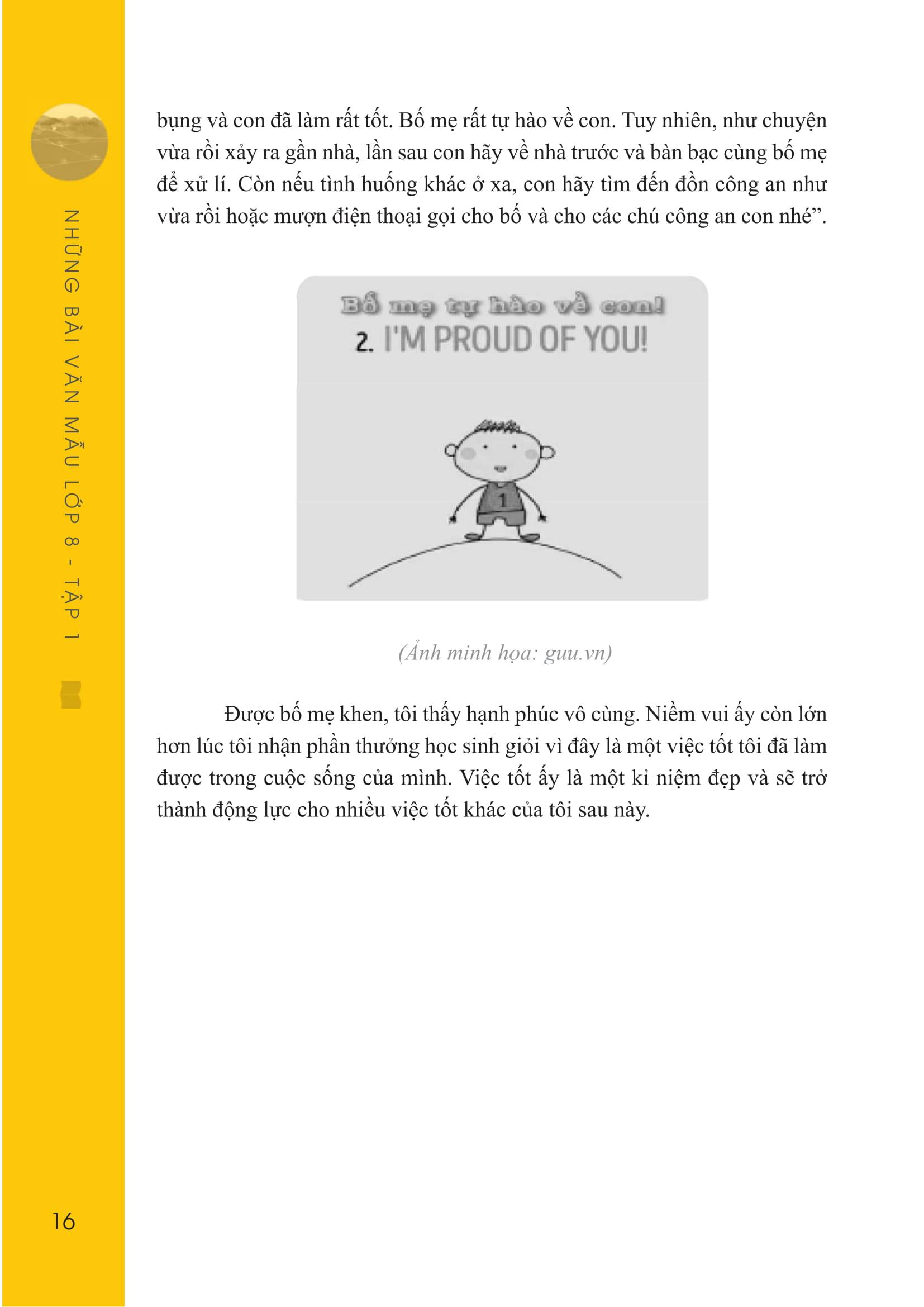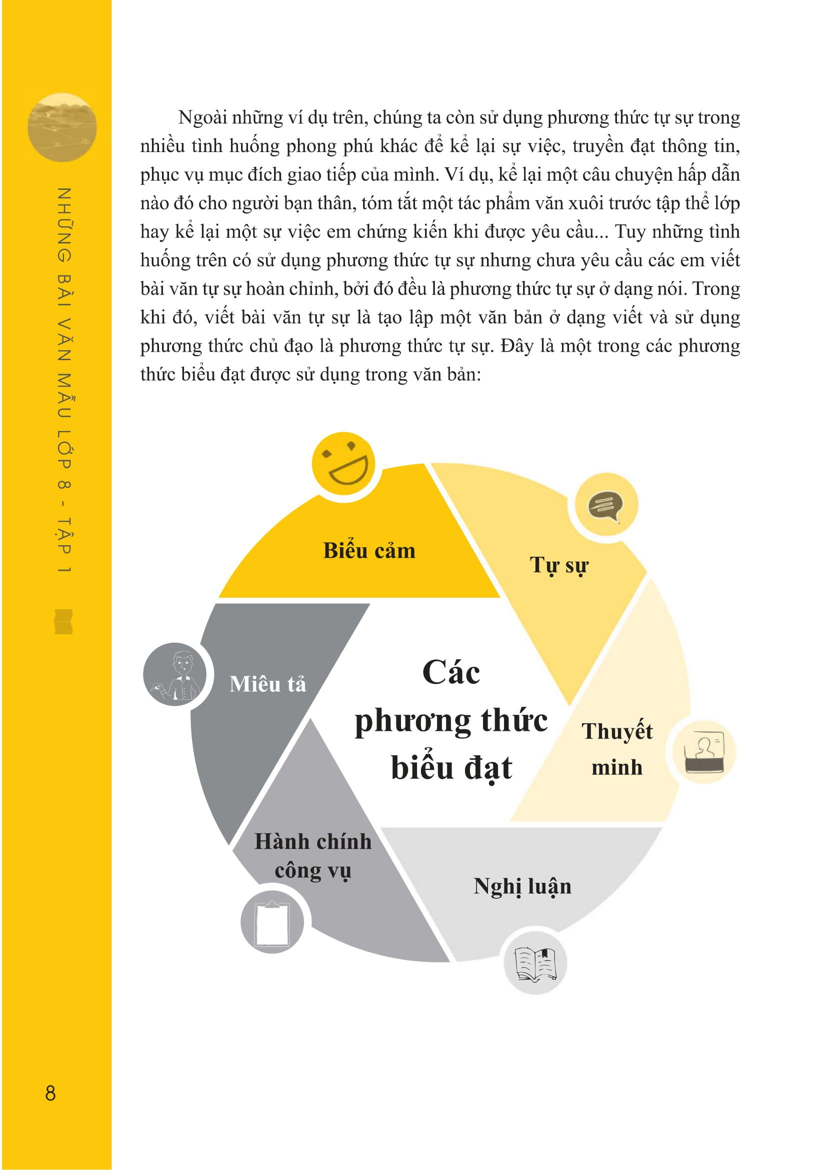 - Và có ai đã từng: Đau khổ với việc làm bài tập và bài kiểm tra? Chờ đợi may mắn và cảm hứng bất chợt? Chờ đợi thầy giỏi cô hay đến với mình? Vậy tại sao các em không tự học bằng nhiều cách, trong đó có cách tự học với những bài văn mẫu? Với mong muốn giúp đỡ cho các em học sinh lớp 8 có được tài liệu tham khảo bám sát với các bài học trên lớp và mở rộng thêm nhiều kiến thức, chúng tôi xin giới thiệu tới các em cuốn sách “Những bài văn mẫu lớp 8”. Cuốn sách văn mẫu này sẽ cung cấp cho các em học sinh lớp 8 những gì? Hướng dẫn tự học với văn mẫu đúng cách, hiệu quả Văn mẫu không phải là một cái phao cứu trợ, không phải là thứ để các em sao chép. Văn mẫu là một công cụ hữu ích cho quá trình tự học nếu các em biết dùng đúng cách. Cuốn sách này sẽ cung cấp phương pháp cụ thể cho từng kiểu bài, giúp các em có thể vận dụng linh hoạt, giải quyết tốt các đề văn khác nhau mà không lúng túng, bỡ ngỡ. Từ phương pháp các em dễ dàng hình thành cách tư duy để giải quyết một vấn đề cụ thể. Rèn kĩ năng viết các kiểu đoạn văn, bài văn tự sự, thuyết minh và nghị luận văn học “Những bài văn mẫu lớp 8” giới thiệu những đoạn, bài văn hay, hoàn chỉnh để các em tham khảo, mở rộng và làm giàu vốn từ, nâng cao khả năng diễn đạt. Từ các bài văn mẫu các em sẽ biết được để có một bài văn hay mình cần thực hiện những bước nào. Qua đó hình thành, phát triển tư duy logic, khả năng ngôn ngữ, lập luận, phản biện vấn đề. Nhờ vậy những kiểu bài tự sự hay thuyết minh, nghị luận văn học sẽ trở nên thật đơn giản với các em. Là cuốn sách đầu tiên hướng dẫn sử dụng văn mẫu có hiệu quả, chia sẻ những tiêu chí để làm được bài văn đúng và hay. Các đề văn thường kèm theo các hình ảnh minh họa thực tế giúp các em dễ dàng liên tưởng, tưởng tượng và sáng tạo câu từ. Phụ huynh và học sinh hãy nhanh tay đặt mua ngay cuốn sách bổ ích này để việc học văn của các em trở nên thú vị hơn nhé!