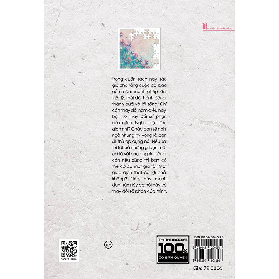 Cuộc sống là một bức tranh gồm nhiều mảnh ghép. Tùy theo cách chúng được sắp xếp mà chúng ta có cuộc sống hiện tại của mình. Đa phần chúng ta bỏ mặc cho các mảnh ghép tự tìm ra vị trí của chúng, nên chúng thường lệch lạc, không khớp với nhau, từ đó tạo ra bức tranh cuộc đời nhạt nhòa và không như ý. Những người thành công đều tự mình sắp xếp các mảnh ghép này, chính xác hơn họ chỉ tập trung vào năm mảnh ghép quan trọng nhất, chỉ cần sắp xếp đúng vị trí của chúng, mọi thứ khác sẽ tự động đi vào trật tự.