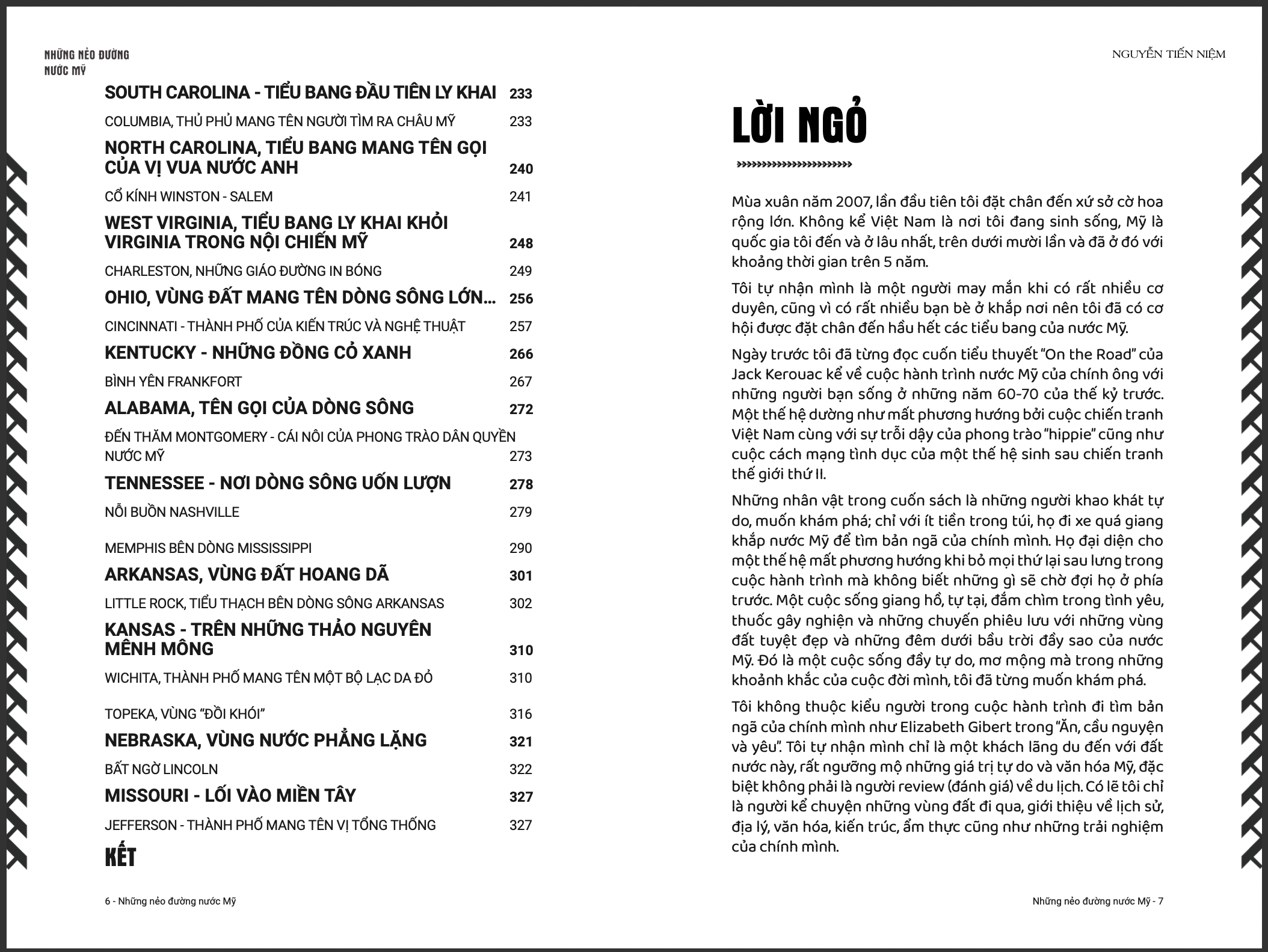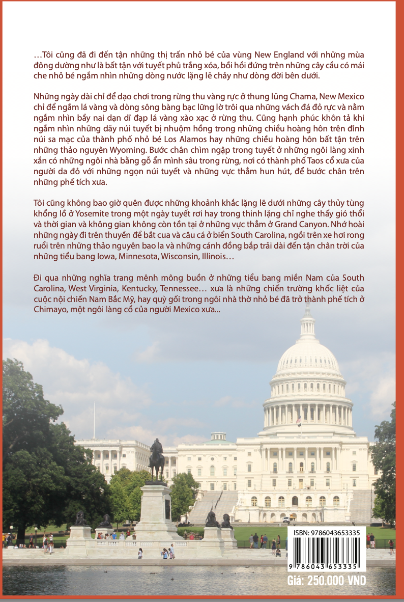 Mùa xuân năm 2007, lần đầu tiên tôi đặt chân đến xứ sở cờ hoa rộng lớn. Không kể Việt Nam là nơi tôi đang sinh sống, Mỹ là quốc gia tôi đến và ở lâu nhất, trên dưới 10 lần và đã ở đó với khoảng thời gian trên 5 năm. Tôi tự nhận mình là một người may mắn khi có rất nhiều cơ duyên, cũng vì có rất nhiều bạn bè ở khắp nơi nên tôi đã có cơ hội được đặt chân đến hầu hết các tiểu bang của nước Mỹ.  Ngày trước tôi đã từng đọc cuốn tiểu thuyết “On the Road” của Jack Kerouac khi ông kể về cuộc hành trình nước Mỹ của chính ông với những người bạn sống ở những năm của thập niên 60-70 của thế kỷ trước. Một thế hệ dường như mất phương hướng bởi cuộc chiến Việt Nam cùng với sự trỗi dậy của phong trào “hippie” cũng như cuộc cách mạng tình dục của một thế hệ sinh sau chiến tranh thế giới thứ II.  Những nhân vật trong cuốn sách là những người khao khát tự do, muốn khám phá, chỉ với ít tiền trong túi, họ đi xe quá giang khắp nước Mỹ để tìm bản ngã của chính mình. Họ đại diện cho một thế hệ mất phương hướng khi bỏ mọi thứ lại sau lưng trong cuộc hành trình mà không biết những gì sẽ chờ đợi họ ở phía trước. Một cuộc sống giang hồ, tự tại đắm chìm trong tình yêu, thuốc gây nghiện và những chuyến phiêu lưu với những vùng đất tuyệt đẹp và những đêm dưới bầu trời đầy sao của nước Mỹ. Đó là một cuộc sống đầy tự do, mơ mộng mà trong những khoảnh khắc của cuộc đời mình, tôi đã từng muốn khám phá. “Tôi không thuộc kiểu người trong cuộc hành trình đi tìm bản ngã của chính mình như Elizabeth Gibert trong “Ăn, Cầu nguyện và Yêu”. Tôi tự nhận mình chỉ là một khách lãng du đến với đất nước này, rất ngưỡng mộ những giá trị tự do và văn hóa Mỹ, đặc biệt không phải là người review (đánh giá) về du lịch. Có lẽ tôi chỉ là người kể chuyện những vùng đất đi qua, giới thiệu về lịch sử, địa lý, văn hóa, kiến trúc, ẩm thực cũng như những trải nghiệm của chính mình.” Trong hành trình dọc ngang khắp nước Mỹ tôi đã sử dụng rất nhiều phương tiện khác nhau như máy bay, phà, tàu điện, xe lửa, taxi, xe bus, tàu thuyền, xe đạp, xe hơi và… cả cuốc bộ. Tôi đã trải qua những chuyến đi dài. Có những nơi chỉ đi ngang qua ngắm thiên nhiên, ghé vô những thành phố lớn đặc trưng tiêu biểu. Nhưng cũng có những vùng đất tôi ở vài ba tháng, thậm chí cả năm trời. Nhưng dù chỉ là lướt qua trong khoảnh khắc hay ở lâu dài thì tất cả đều cho tôi những trải nghiệm khó quên.  Tôi đã từng lang thang ở Times Square, nơi có những dòng người như nước chảy bất tận từ khắp nơi trên thế giới đổ về, cũng đã đặt chân lên tới đỉnh của tòa nhà Empire State Building, nơi King Kong (trong một bộ phim) đã từng chụp bắt những chiếc trực thăng mà ném xuống đất như những món đồ chơi, rồi từ trên đó tôi có thể nhìn thấy những tòa nhà chọc trời của Manhattan.  Tôi cũng đã đi đến tận những thị trấn nhỏ bé của vùng New England với những mùa đông dường như là bất tận với tuyết phủ trắng xóa, bồi hồi đứng trên những cây cầu có mái che nhỏ bé ngắm nhìn những dòng nước lặng lẽ chảy như dòng đời bên dưới.  Những ngày dài chỉ để dạo chơi trong rừng thu vàng rực ở thung lũng Chama, New Mexico chỉ để ngắm lá vàng và dòng sông bàng bạc lững lờ trôi qua những vách đá đỏ rực và nằm ngắm nhìn bầy nai dạn dĩ đạp lá vàng xào xạc ở rừng thu.  Cũng hạnh phúc khôn tả khi ngắm nhìn những dãy núi tuyết bị nhuộm hồng trong những chiều hoàng hôn trên đỉnh núi sa mạc của thành phố nhỏ bé Los Alamos hay những chiều hoàng hôn bất tận trên những thảo nguyên Wyoming.  Bước chân chìm ngập trong tuyết ở những ngôi làng xinh xắn có những ngôi nhà bằng gỗ ẩn mình sâu trong rừng, nơi có thành phố Taos cổ xưa của người da đỏ với những ngọn núi tuyết và những vực thẳm hun hút, để bước chân trên những phế tích xưa.  Tôi cũng không bao giờ quên được những khoảnh khắc lặng lẽ dưới những cây thủy tùng khổng lồ ở Yosemite, trong một ngày tuyết rơi hay trong thinh lặng chỉ nghe thấy gió thổi và thời gian,không gian không còn tồn tại ở những vực thẳm ở Grand Canyon.  Tôi nhớ hoài những ngày đi trên thuyền để bắt cua và câu cá ở biển South Carolina, ngồi trên xe hơi rong ruổi trên những thảo nguyên bao la và những cánh đồng bắp trải dài đến tận chân trời của những tiểu bang Iowa, Minnesota, Wisconsin, Illinois…  Đi qua những nghĩa trang mênh mông buồn ở những tiểu bang miền Nam của South Carolina, West Virginia, Kentucky, Tennessee… xưa là những chiến trường khốc liệt của cuộc nội chiến Nam Bắc Mỹ, hay quỳ gối trong ngôi nhà thờ nhỏ bé đã trở thành phế tích ở Chimayo, một ngôi làng cổ của người Mexico xưa.  Ở đâu cũng để lại cho tôi những ấn tượng không bao giờ quên. Những thước phim q