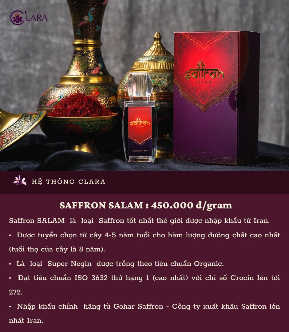 SAFFRON IRAN Saffron Iran được Tổ chức Lương thực và Nông nghiệp Liên Hợp Quốc FAO’s công nhận là loại tốt nhất trên thế giới. Là trung tâm phân phối Saffron lớn nhất Việt Nam,