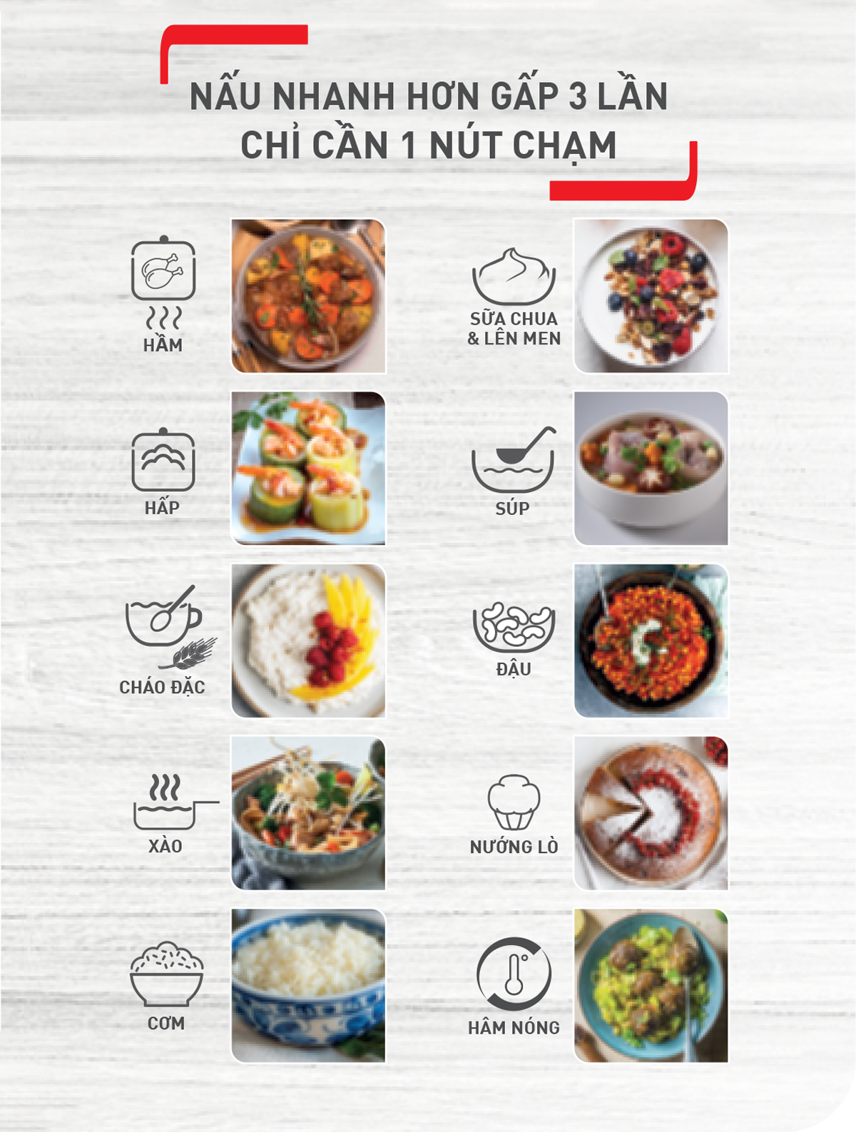 - 10 chương trình nấu tự động, được cài đặt sẵn, dẽ dàng chế biến các món hầm, hấp, cháo, xào, nấu cơm, sữa chua, canh súp, đậu, nướng,/ làm bánh, hâm nóng.
