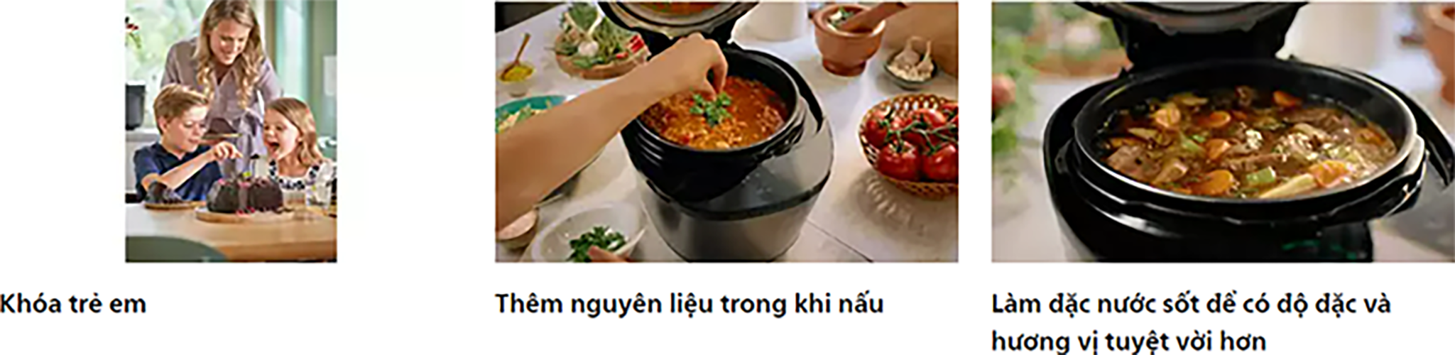 Ngoài ra nồi còn trang bị nhiều tính năng tiện ích khác như thiết lập 3 chương trình nấu yêu thích, tự động giữ ấm sau khi nấu trong 12 giờ, hẹn giờ cài đặt sẵn trong 24 giờ, làm đặc nước sốt để có độ đặc và hương vị tuyệt vời hơn. Từ đó hỗ trợ bạn nấu nướng dễ dàng hơn.