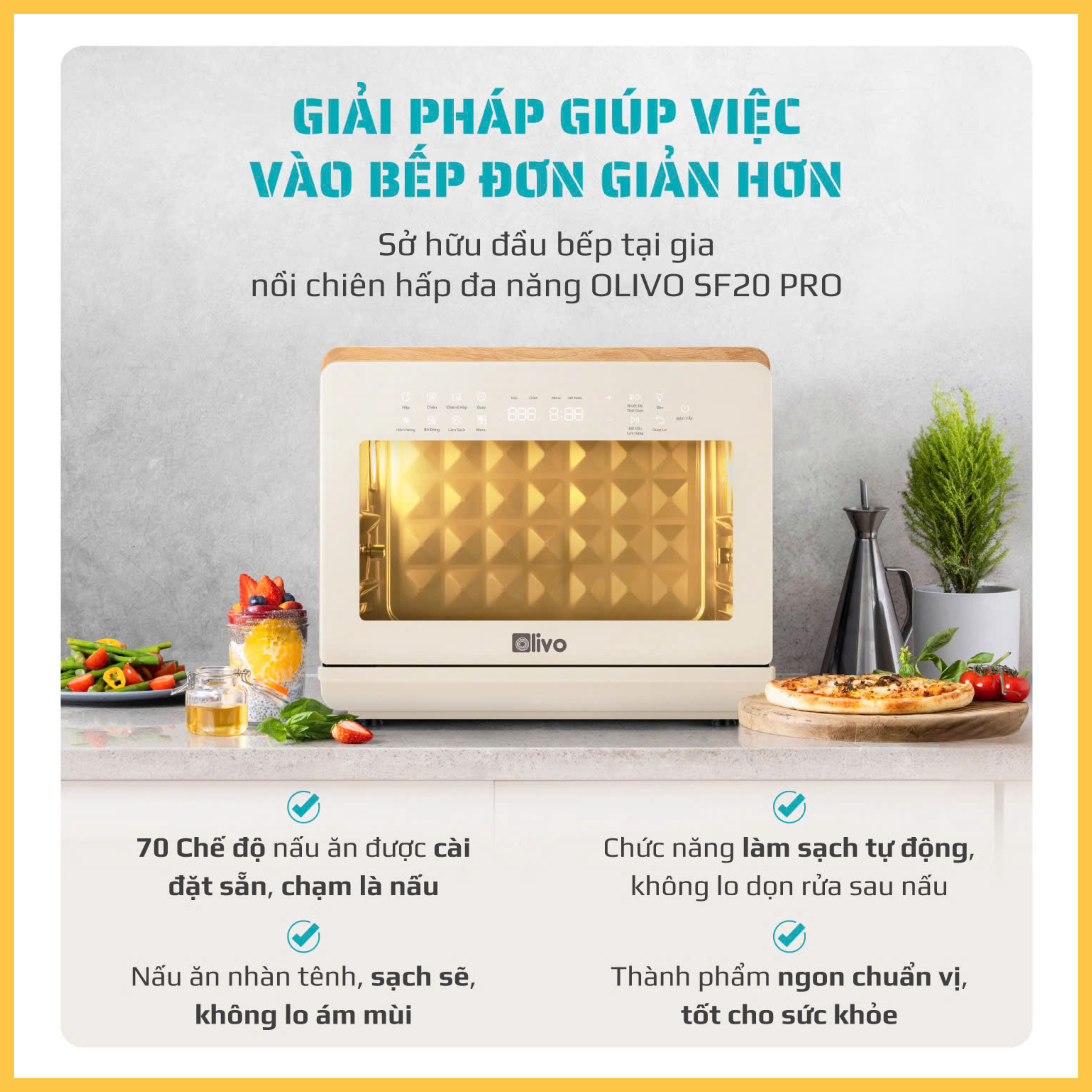 - Trang bị đầy đủ phụ kiện giúp bạn sử dụng thuận tiện, an toàn. Đánh giá nồi chiên hơi nước đa năng Olivo SF20 Pro Thiết kế sang trọng, màu sắc trang nhã Nồi chiên hơi nước Olivo SF20 Pro gây ấn tượng cho người tiêu dùng ngay từ cái nhìn đầu tiên bởi thiết kế hiện đại, tinh tế. Với kiểu dáng vuông vắn, gọn gàng cùng tông màu be thanh lịch, thiết bị này có thể dễ dàng phối hợp hài hòa trong mọi không gian nội thất nhà bếp khác nhau. Cửa lò có phần kính chịu lực, cách nhiệt 2 lớp, đảm bảo an toàn, hạn chế nứt vỡ khi tiếp xúc với nhiệt độ cao. Đặc biệt, phần kính này trong suốt giúp bạn có thể quan sát thực phẩm bên trong dễ dàng mà không cần mở cửa lò, tránh thất thoát nhiệt năng. Dung tích cực lớn 20 lít - cho gia đình đông người Olivo SF20 Pro là mẫu nồi chiên không dầu Olivo có dung tích lớn lên tới 20 lít giúp bạn thoải mái nấu nhiều thực phẩm cùng lúc hoặc những thực phẩm có kích thước to như gà, vịt nguyên con, bánh pizza cỡ lớn... Với mức dung tích này, nồi là lựa chọn lý tưởng cho gia đình đông thành viên hoặc sử dụng trong những bữa tiệc liên hoan. Đa dạng chức năng Nồi chiên hấp đa năng Olivo SF20 Pro chính là một bí quyết giúp tối giản không gian nhà bếp của bạn. Sản phẩm này được tích hợp tới 4 chức năng trong 1 giúp bạn hấp - chiên - hầm - hấp chiên kết hợp nhanh gọn, hỗ trợ sáng tạo nhiều món ngon chiêu đãi cả gia đình. Trong đó: